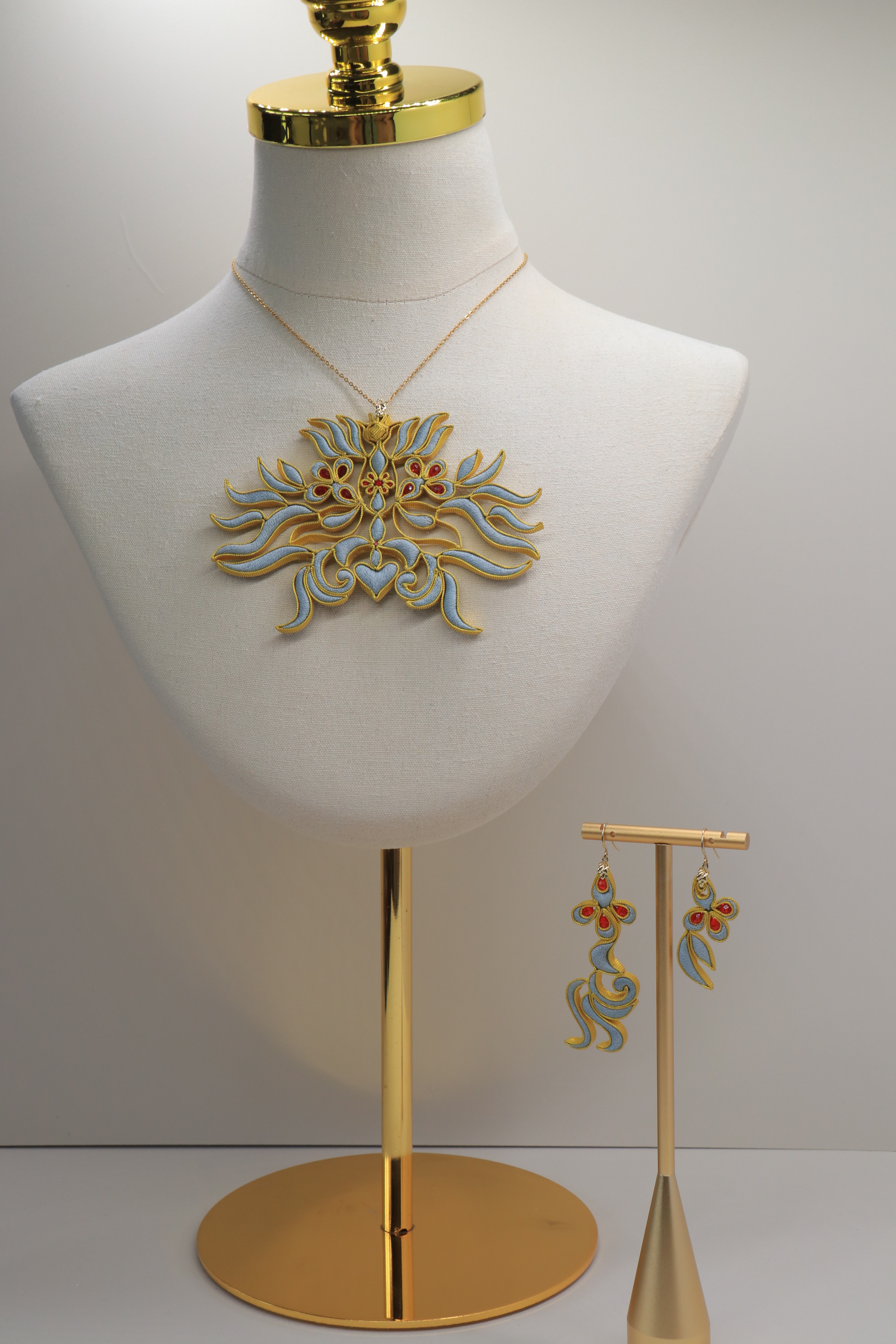 A necklace and a pair of earrings adorned with the Chinese frog buttons showcase the charm of traditional Chinese heritage, transcending its original function. /Photo provided to CGTN