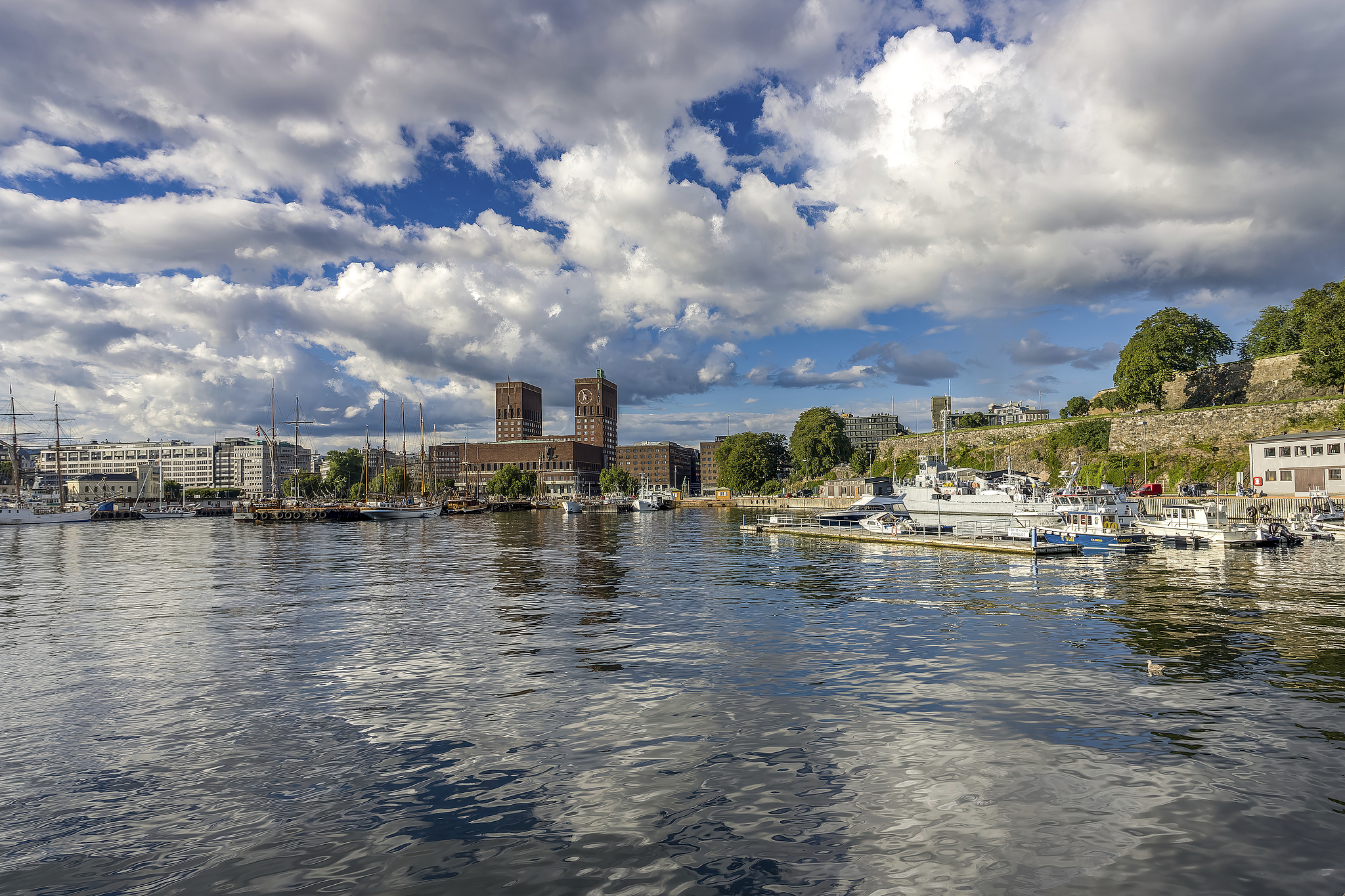 Oslo City Hall stands majestically beside the calm waters of the Fjord under a backdrop of fluffy clouds and blue sky. /VCG