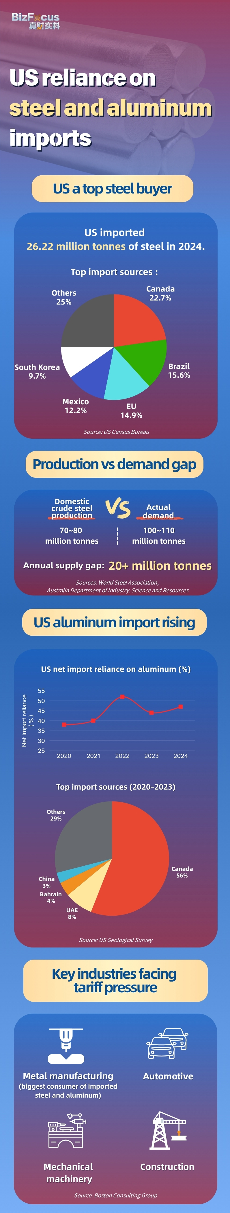 The US announced on Tuesday that it will increase tariffs on steel and aluminum imports from 25 percent to 50 percent, effective June 4, 2025. As one of the world's largest steel importers and a country that relies on imports for 47 percent of its aluminum supply, the tariff hike will raise costs and exert pressure on critical sectors such as metal manufacturing, automotive, and construction. Refer to the poster for more details.