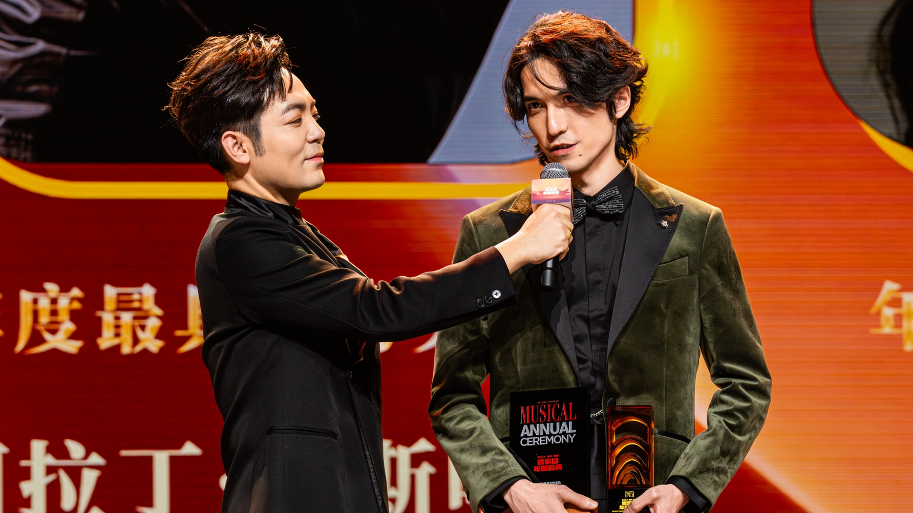 Alading Asihali (R) receives the "Most Promising Actor" award at the 2024 Beijing Tianqiao Musical Annual Ceremony, Beijing, China, November 26, 2024. /Alading Asihali