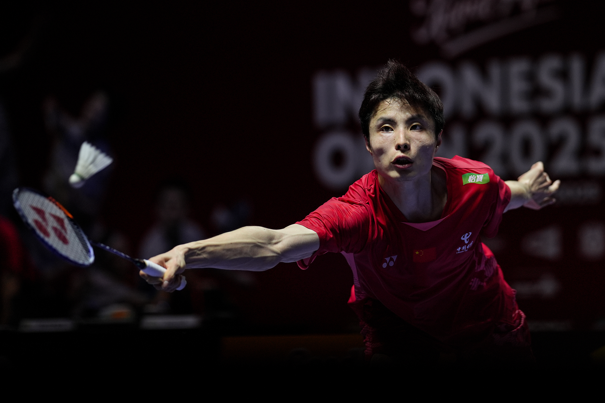 Shi Yuqi of China hits a shot in the men's singles match against Yushi Tanaka of Japan at the Indonesia Open in Jakarta, Indonesia, June 5, 2025. /VCG
