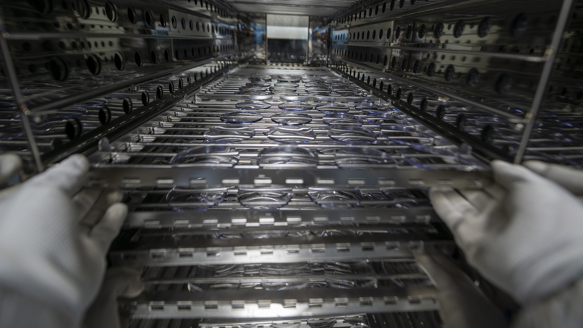 A view of lenses at a dust-free workshop of an eyewear factory in Danyang City, east China's Jiangsu Province, February 15, 2022. /VCG