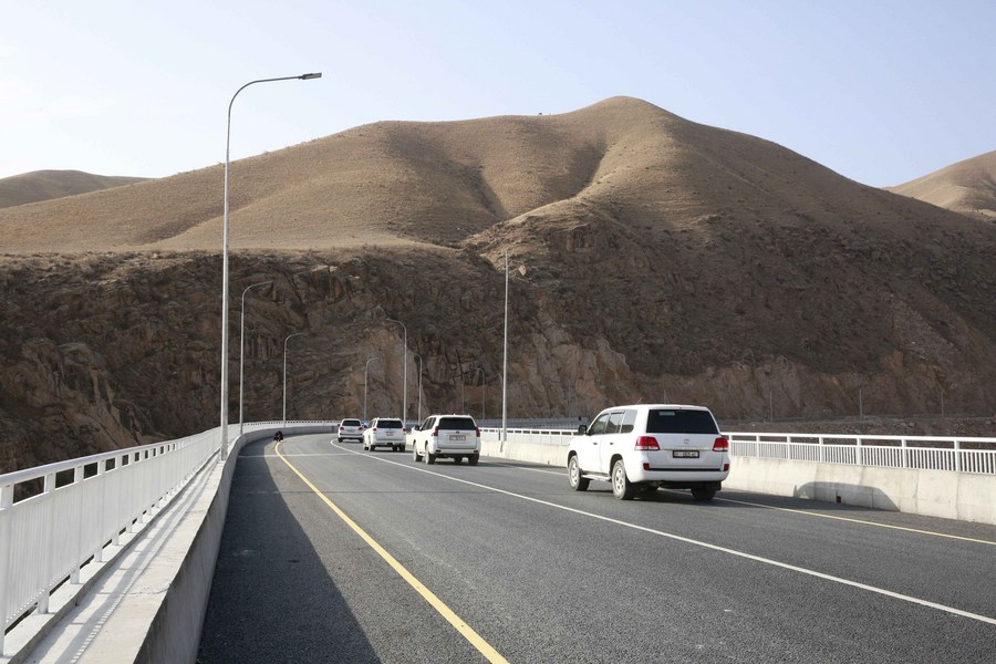 Vehicles running on a bridge completed during the second phase of a new North-South highway project in Kazarman of Jalalabad Region, Kyrgyzstan, November 10, 2021. /Xinhua