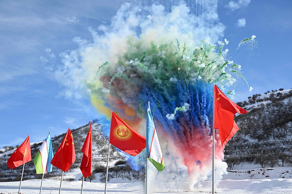 Fireworks explode behind state flags during the commencement ceremony of the China-Kyrgyzstan-Uzbekistan railway project in the settlement of Tash-Kitchu, Kyrgyzstan, December 27, 2024. /VCG