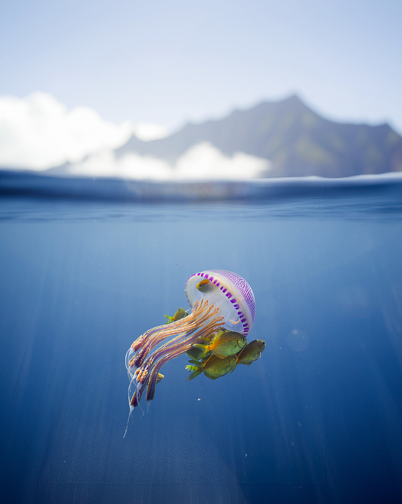 A rare pelagic purple jellyfish is seen with fish shoaling around it for protection in Hawaii, U.S. /VCG