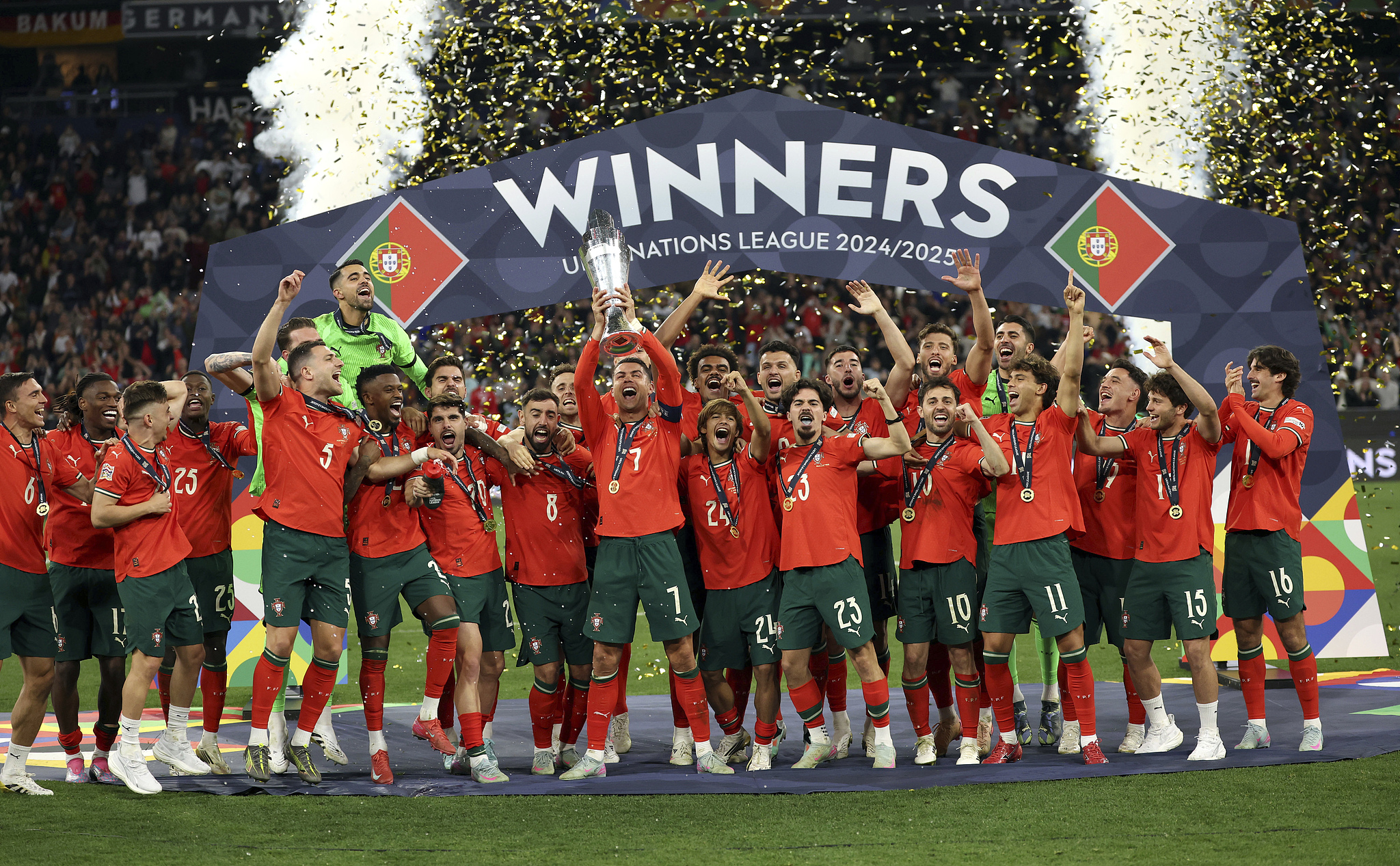Players of Portugal celebrate winning the UEFA Nations League championship after defeating Spain in the final at the Allianz Arena in Munich, Germany, June 8, 2025. /VCG
