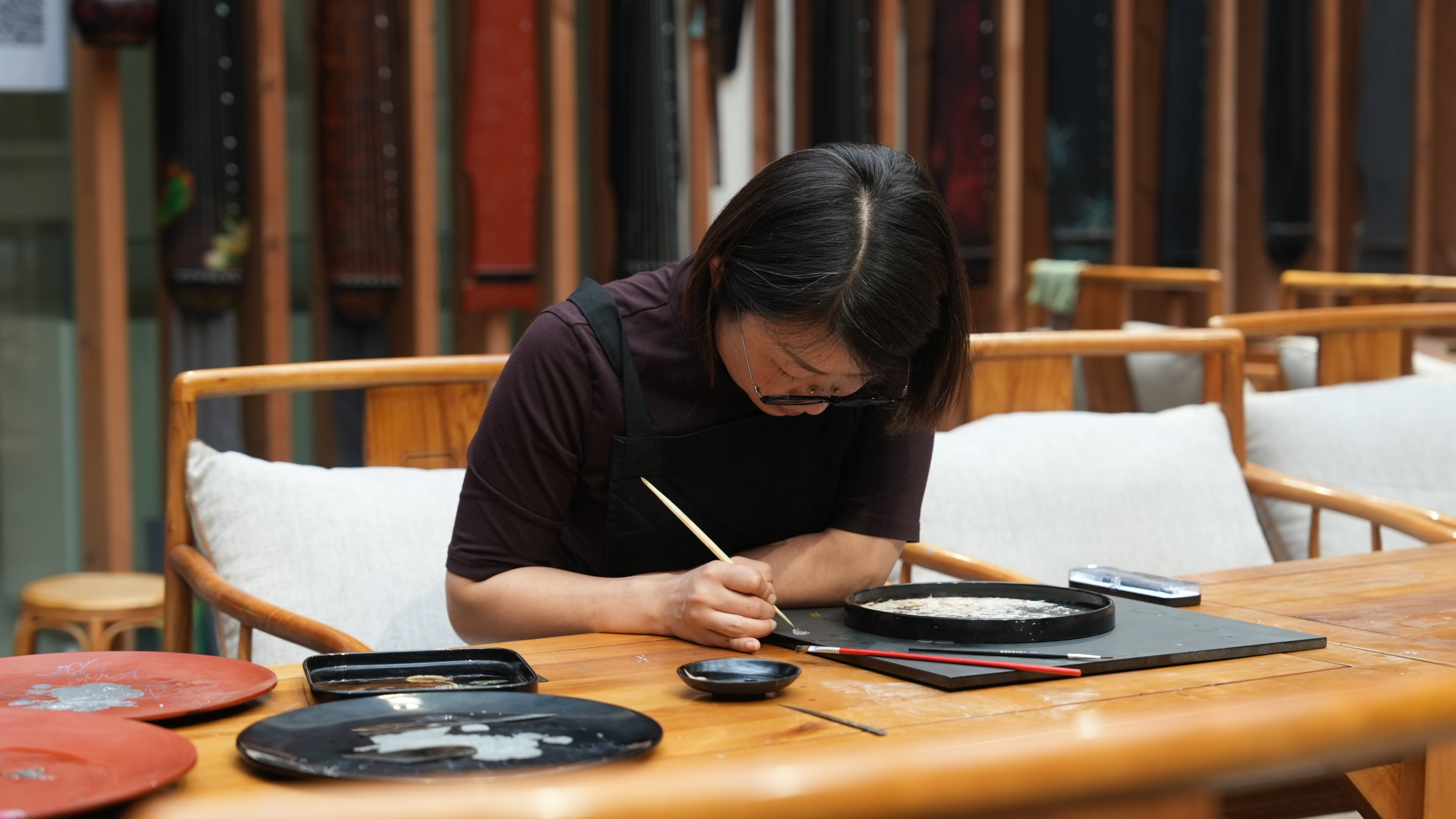 Chen Yu, a representative inheritor of the Chengdu lacquerware intangible cultural heritage, demonstrates the mother-of-pearl inlay technique. /by Zhang Peng
