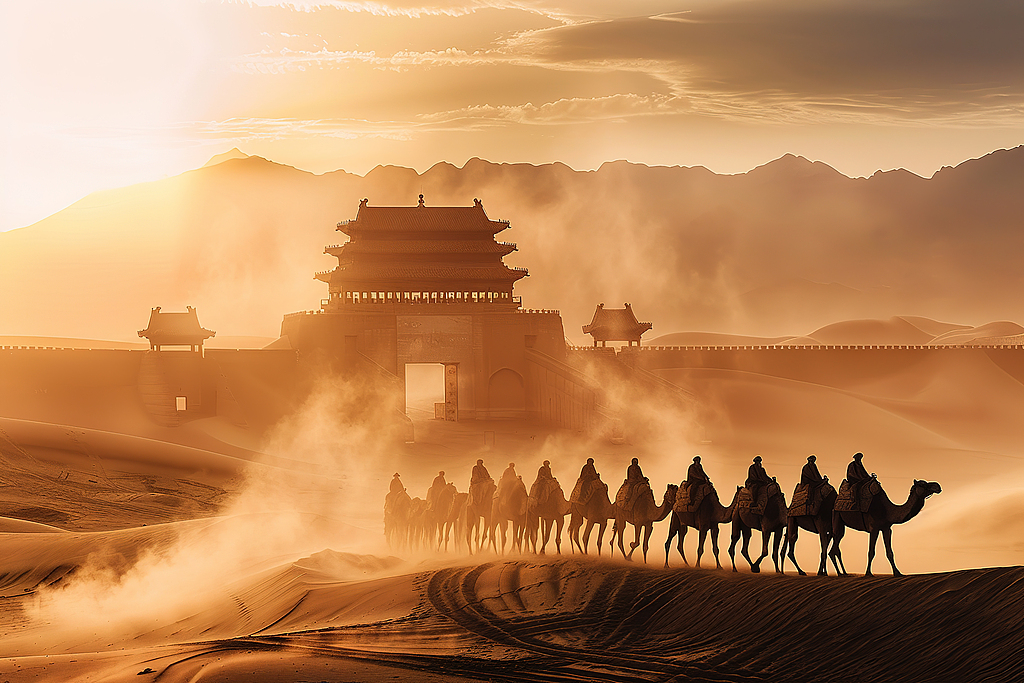 An AI-generated image depicts a camel caravan trekking through the desert away from an ancient Chinese city. /CFP