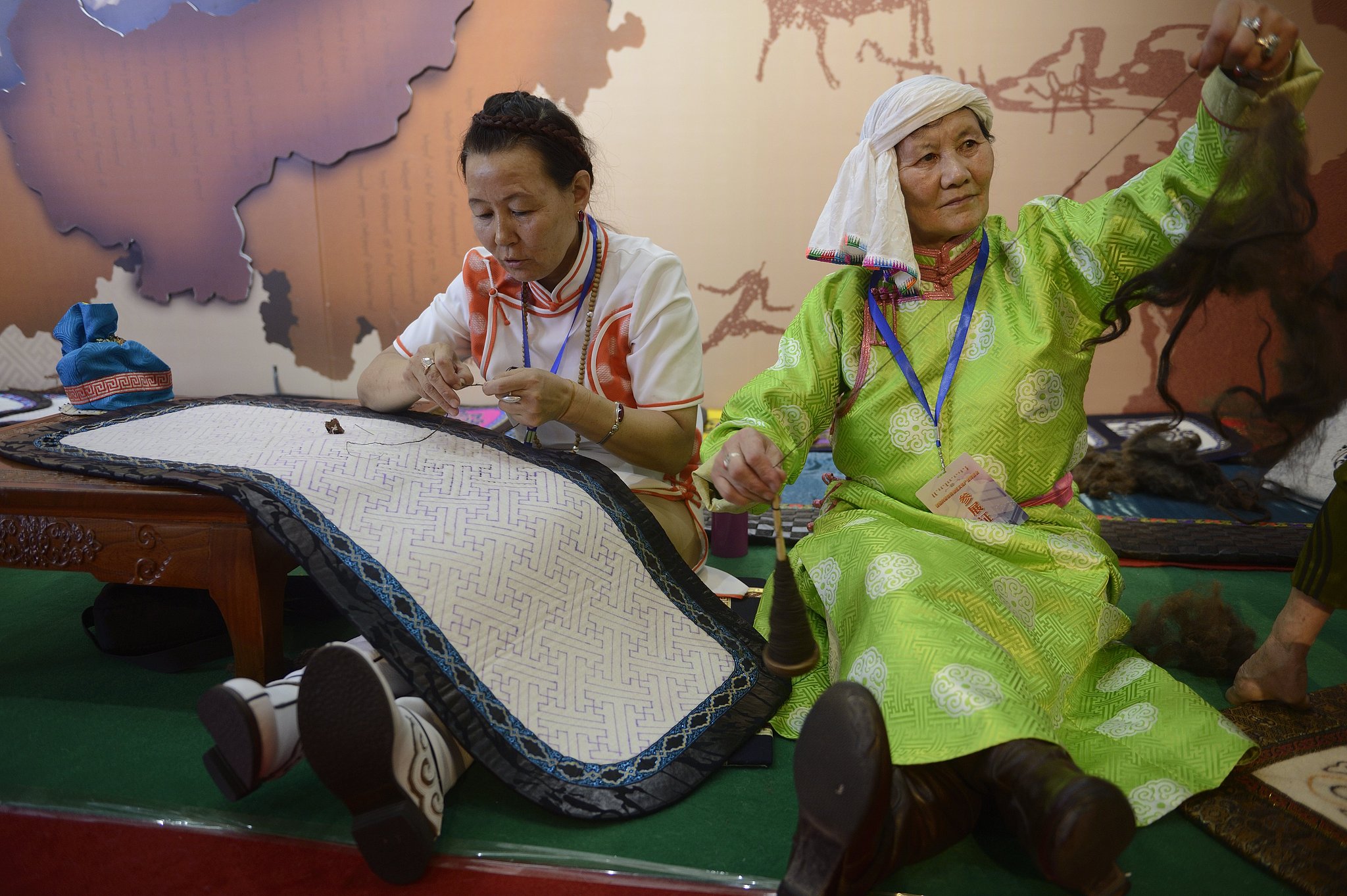 Exhibitors demonstrate traditional Mongolian felt-making techniques at the Inner Mongolia Cultural Industry Expo. /VCG