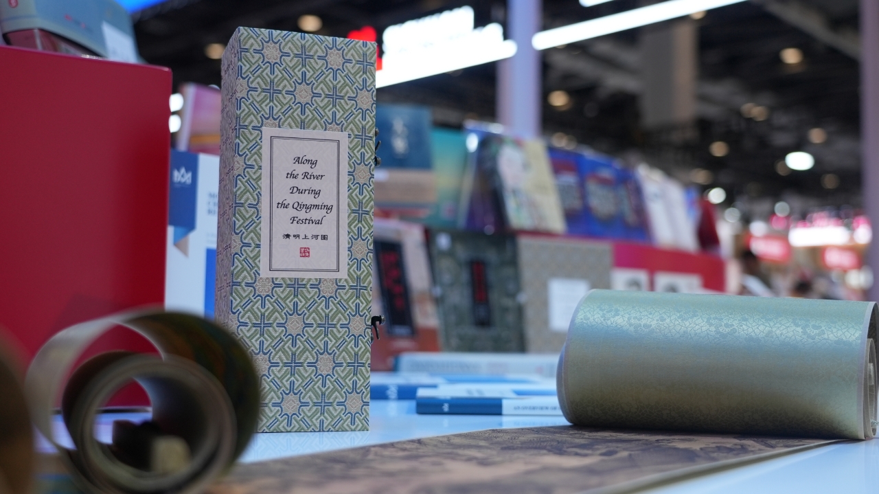 A view of the Chinese painting "Along the River During the Qingming Festival" on display at the China International Publishing Group stand, June 19, 2025.