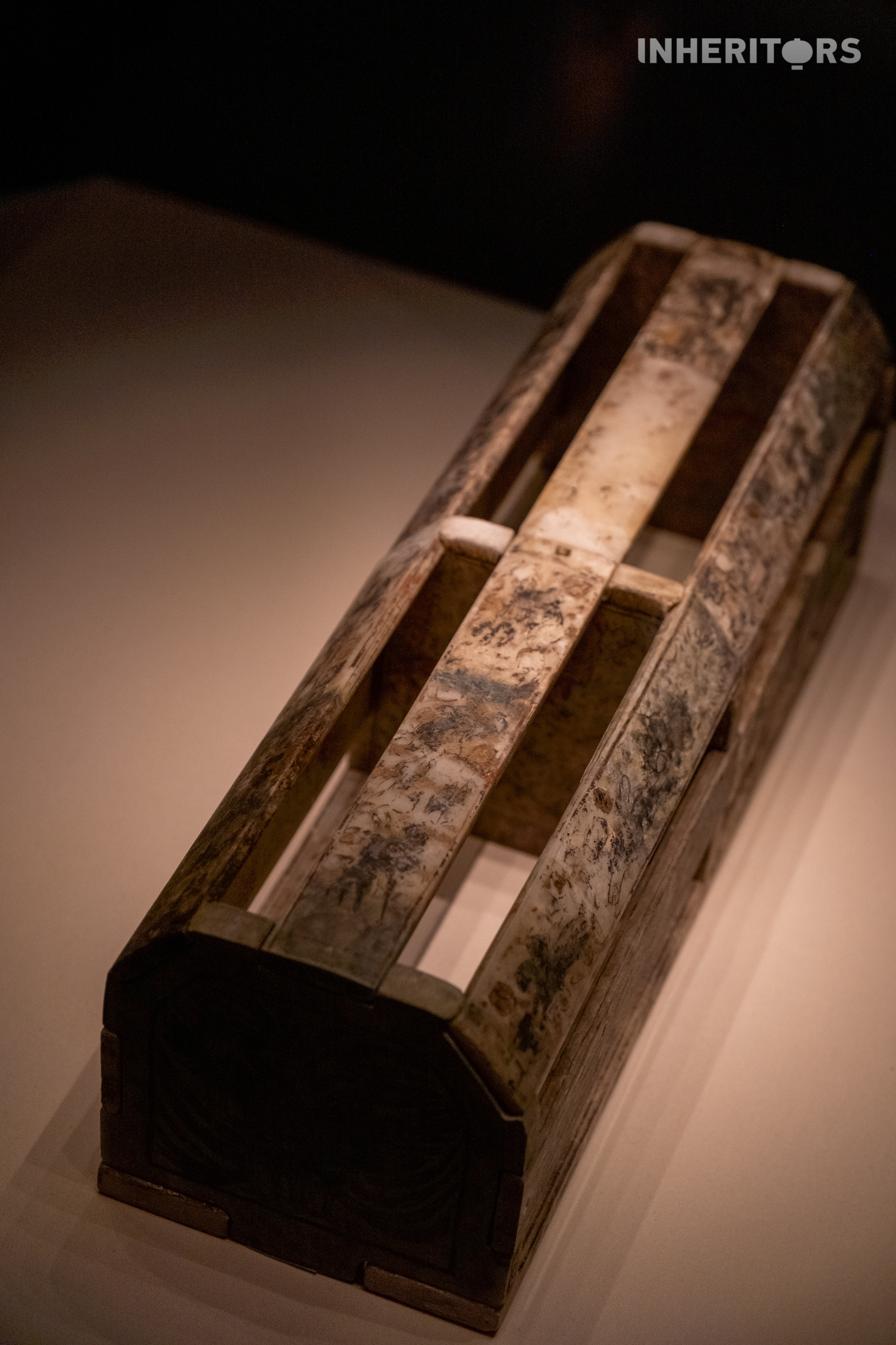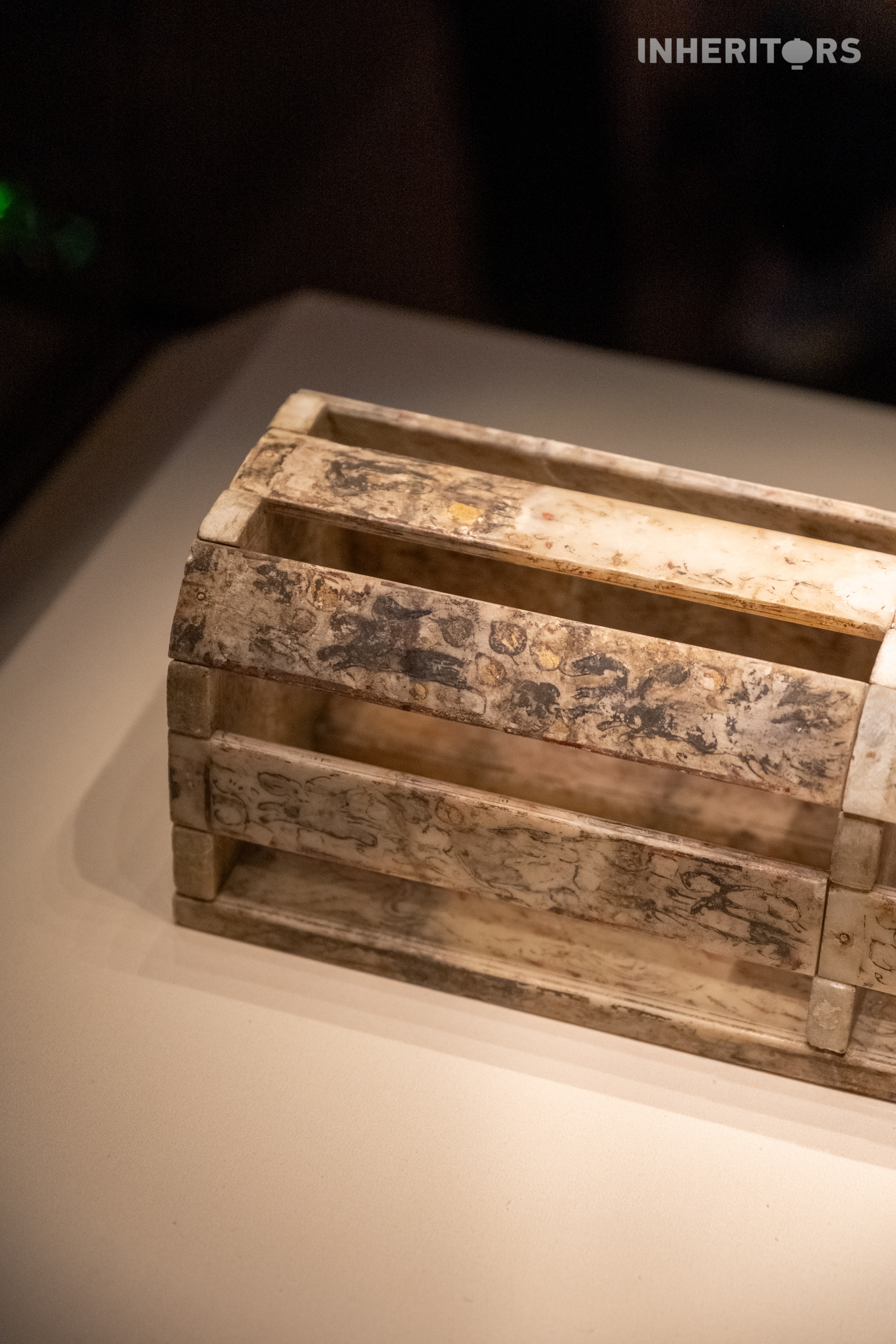 This jade pillow – named "Painted Jade Pillow with Bird, Beast and Cloud Design" – is made from inlaid jade panels and painted with gold patterns of clouds and birds. The pillow was not just decorative: Jade was believed to feel cool to touch and promote restful sleep, making it a practical choice for warm nights.