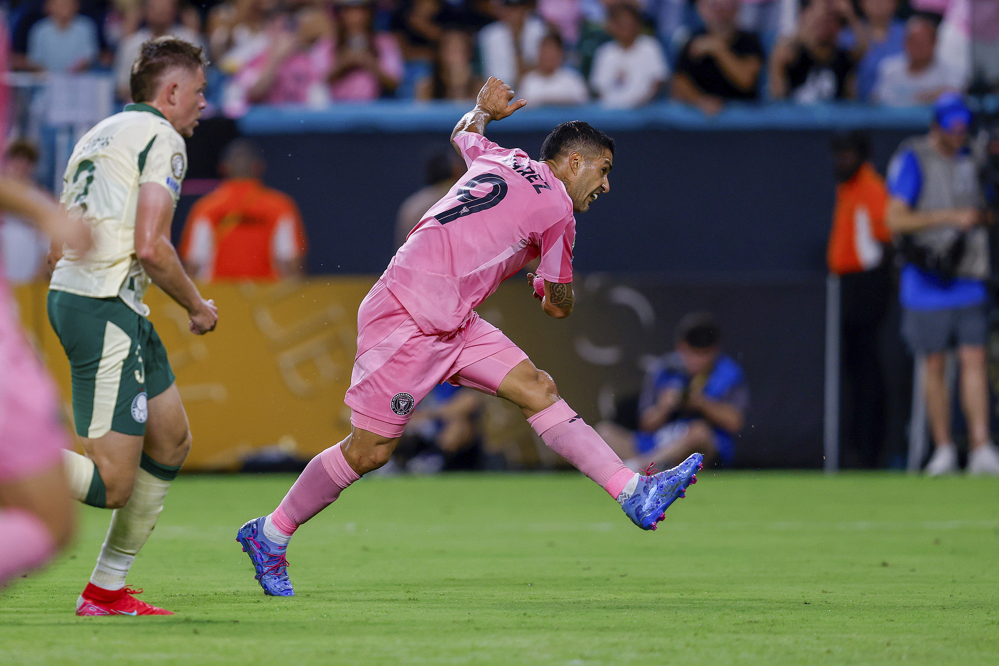 Luis Suarez (#9) of Inter Miami shoots to score a goal in the game against Palmeiras at the FIFA Club World Cup at Hard Rock Stadium in Miami, Florida, June 23, 2025. /VCG
