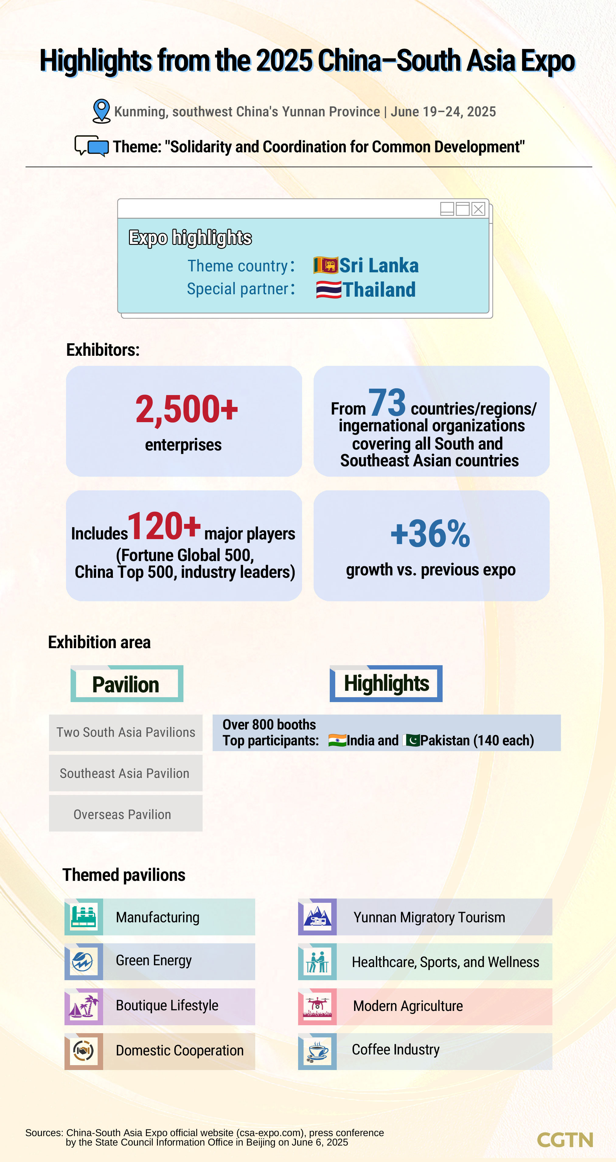 The expo showcased deepening economic ties between China and South and Southeast Asian nations. Featuring over 2,500 exhibitors from 73 countries, regions and international organizations, the expo emphasized green trade, digital innovation and service sector cooperation.