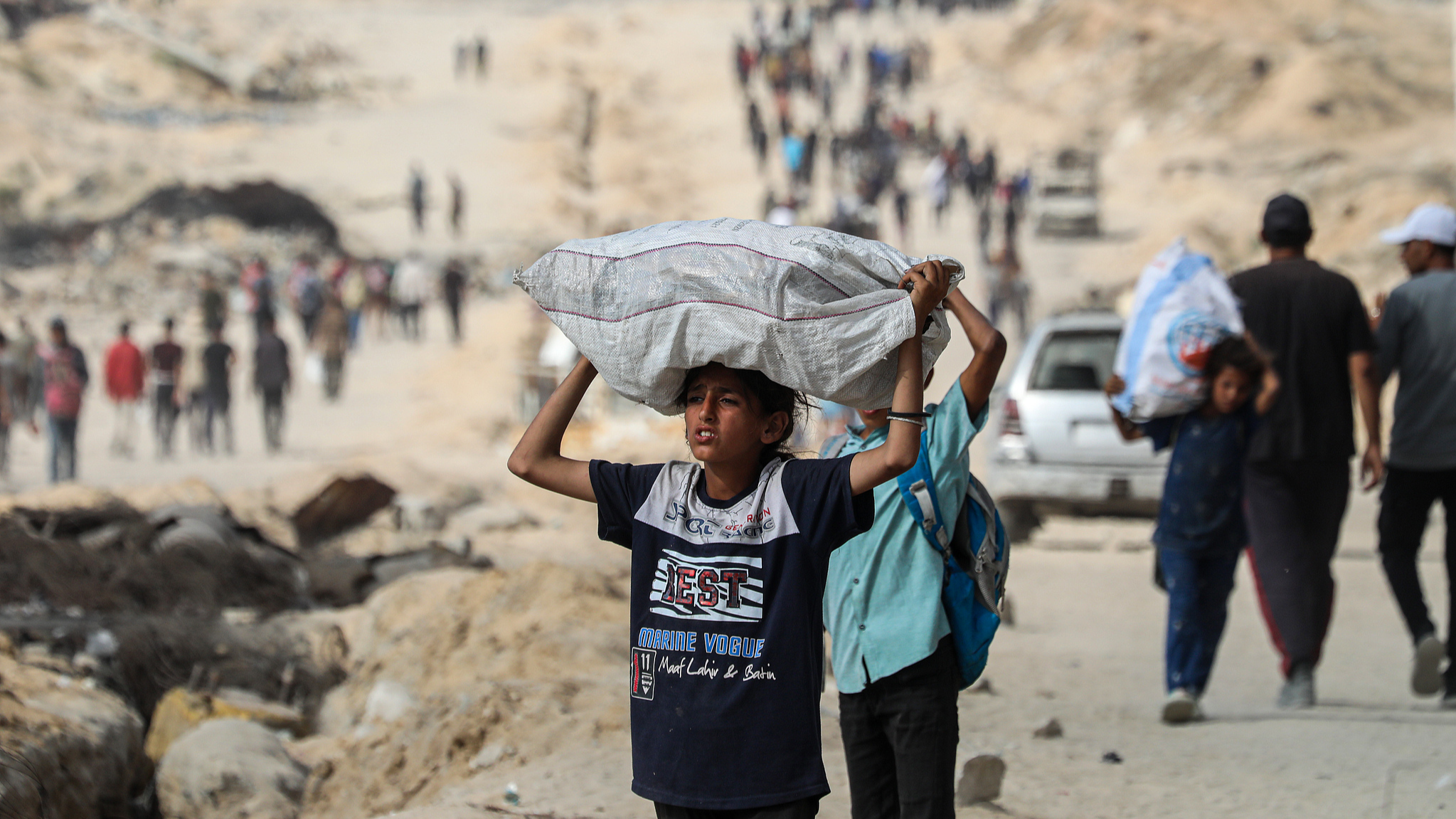 Palestinians gather along the Coastal Road in the Al-Sudaniyya area in northern Gaza as they wait to receive humanitarian aid expected to enter through the Zikim crossing in Gaza, June 24, 2025. /VCG
