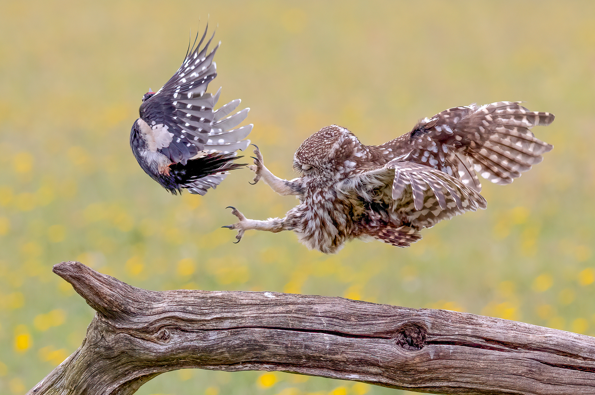A little owl scares a woodpecker off its feeding perch in Worcestershire, the UK, June 15, 2025. /VCG