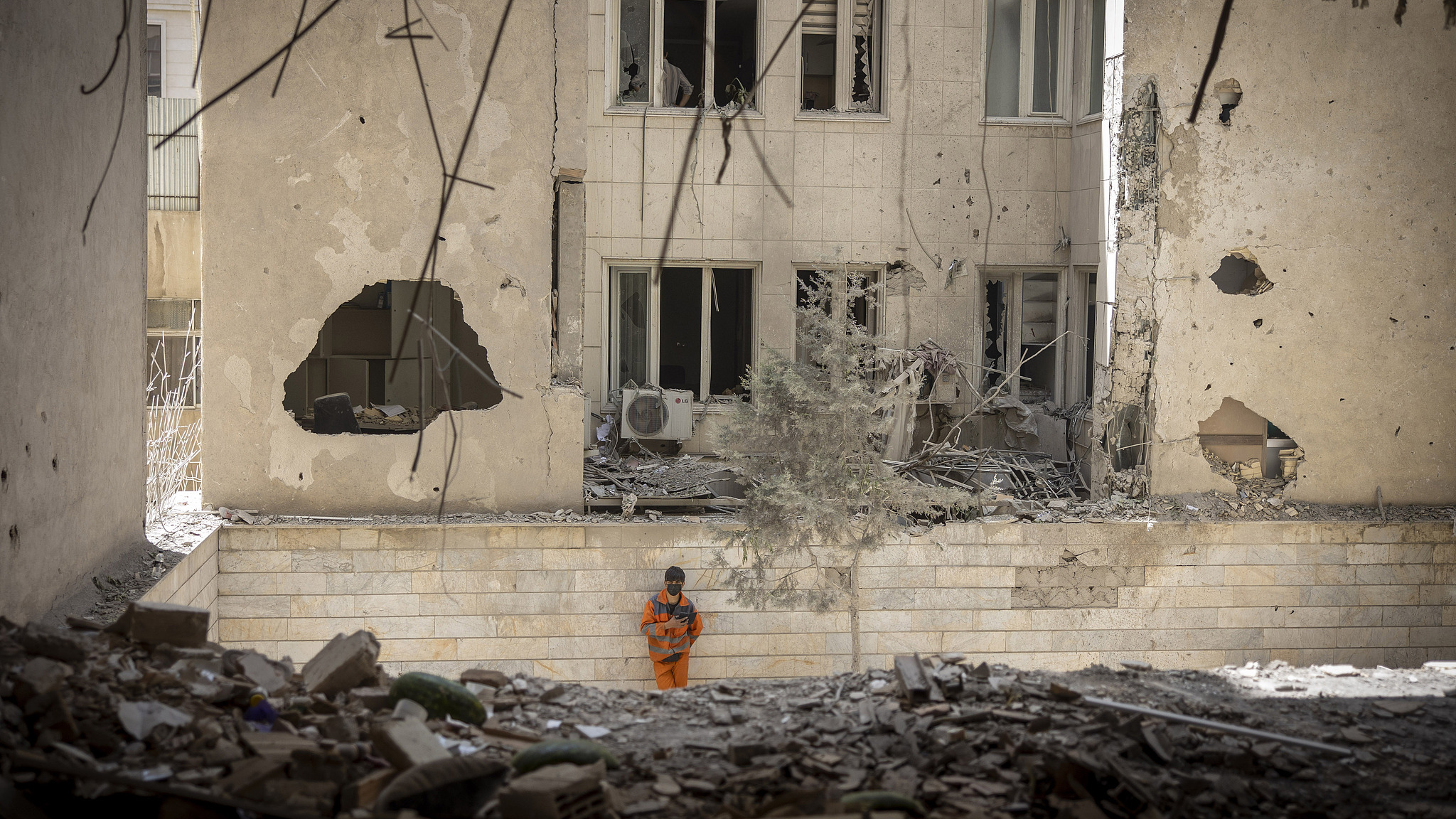 A man stands outside a building in a residential area of Marzdaran district, where Iranian nuclear scientists were hit in recent drone strikes, Tehran, Iran, June 25, 2025. /VCG