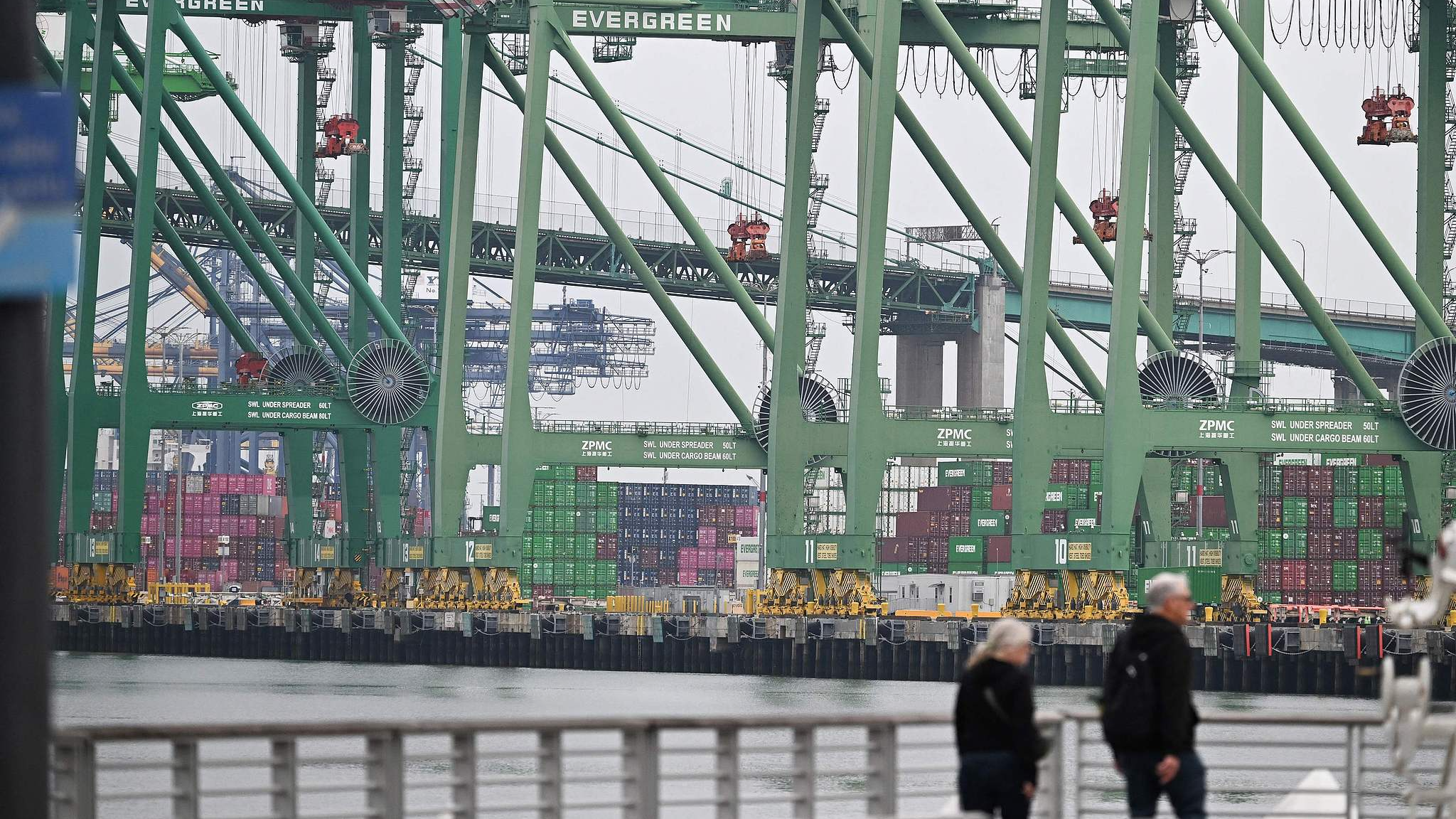 "America's largest port scuttled by Trump's trade war". Visitors walk near the Evergreen terminal at the Port of Los Angeles on April 30, 2025 in the San Pedro neighborhood of Los Angeles, California. /VCG
