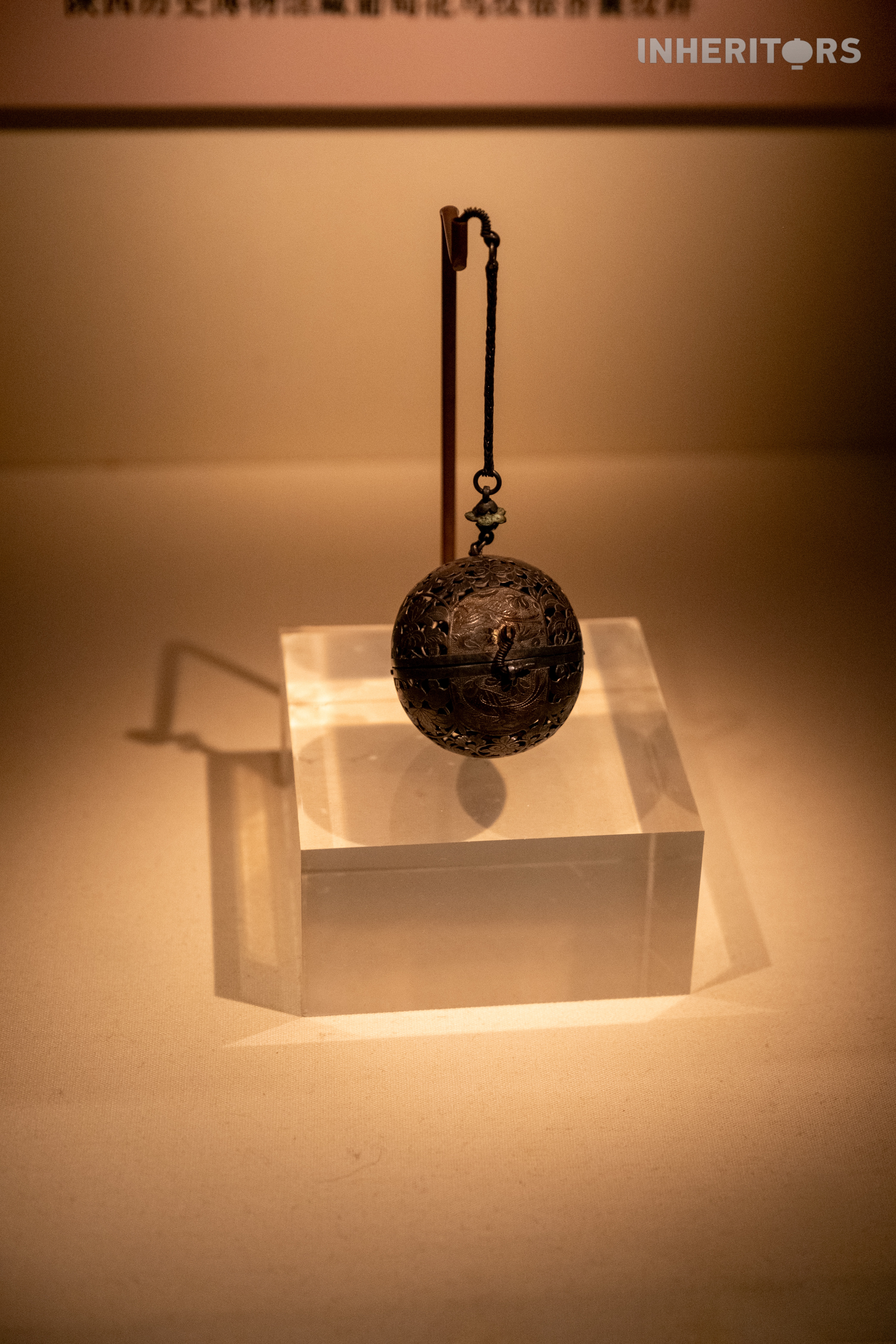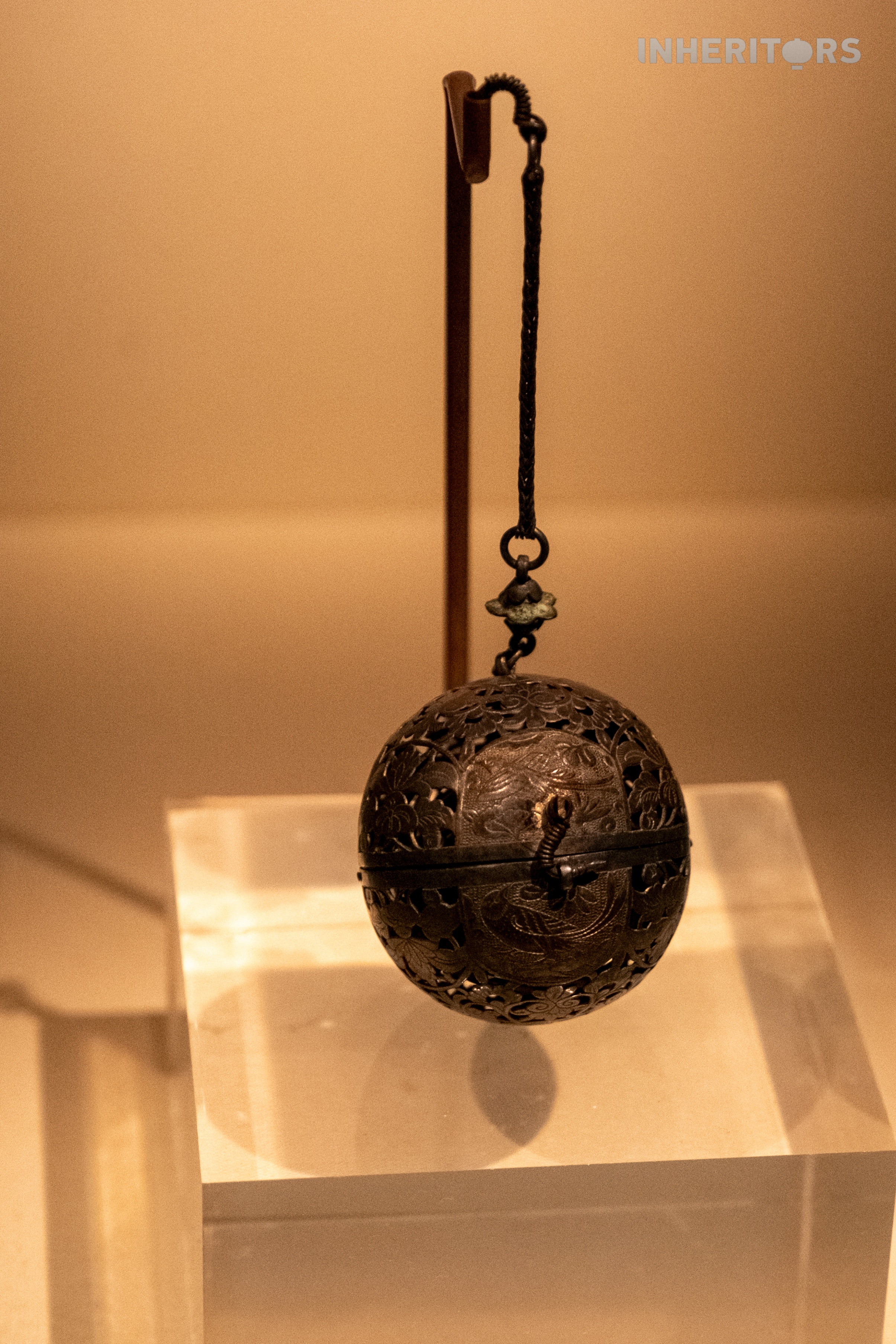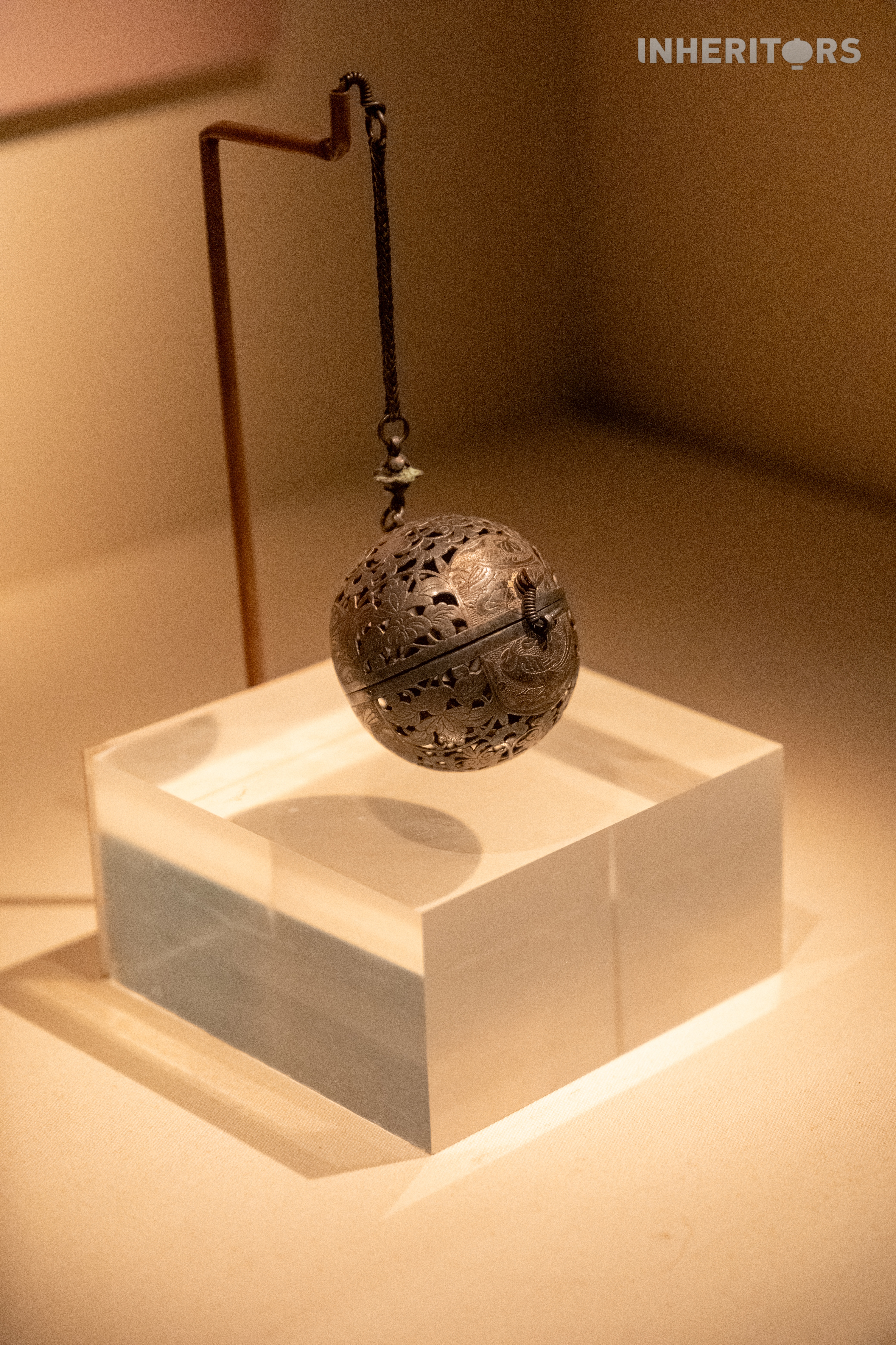 This gilded silver censer is composed of two hemispheres joined by a hidden gimbal structure. No matter how the wearer moved, the incense inside stayed level and didn't spill. The openwork bird-and-flower design allowed the scent to slowly diffuse – combining function and elegance in one refined object.