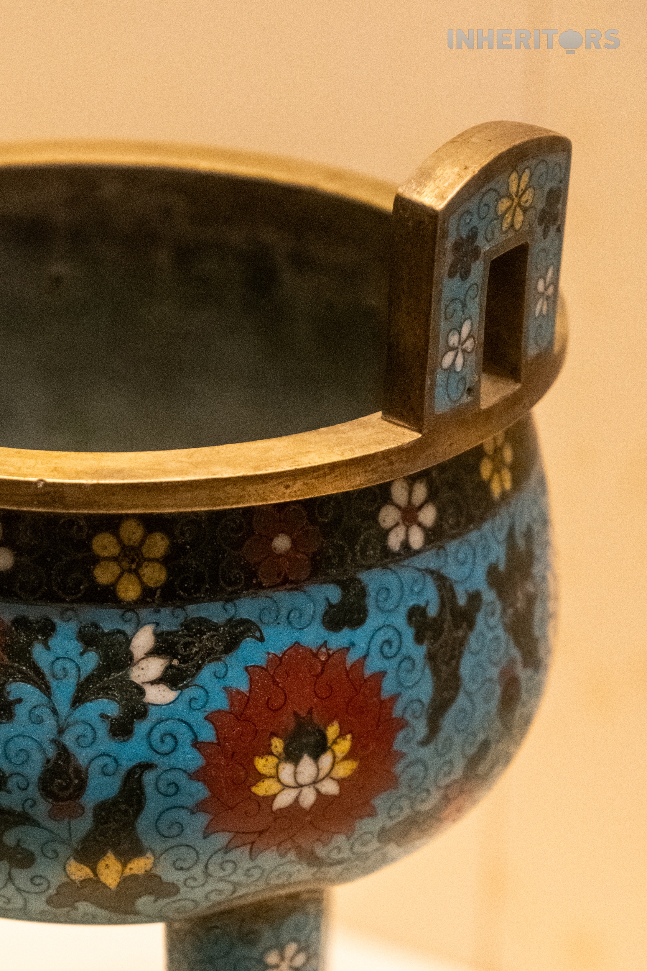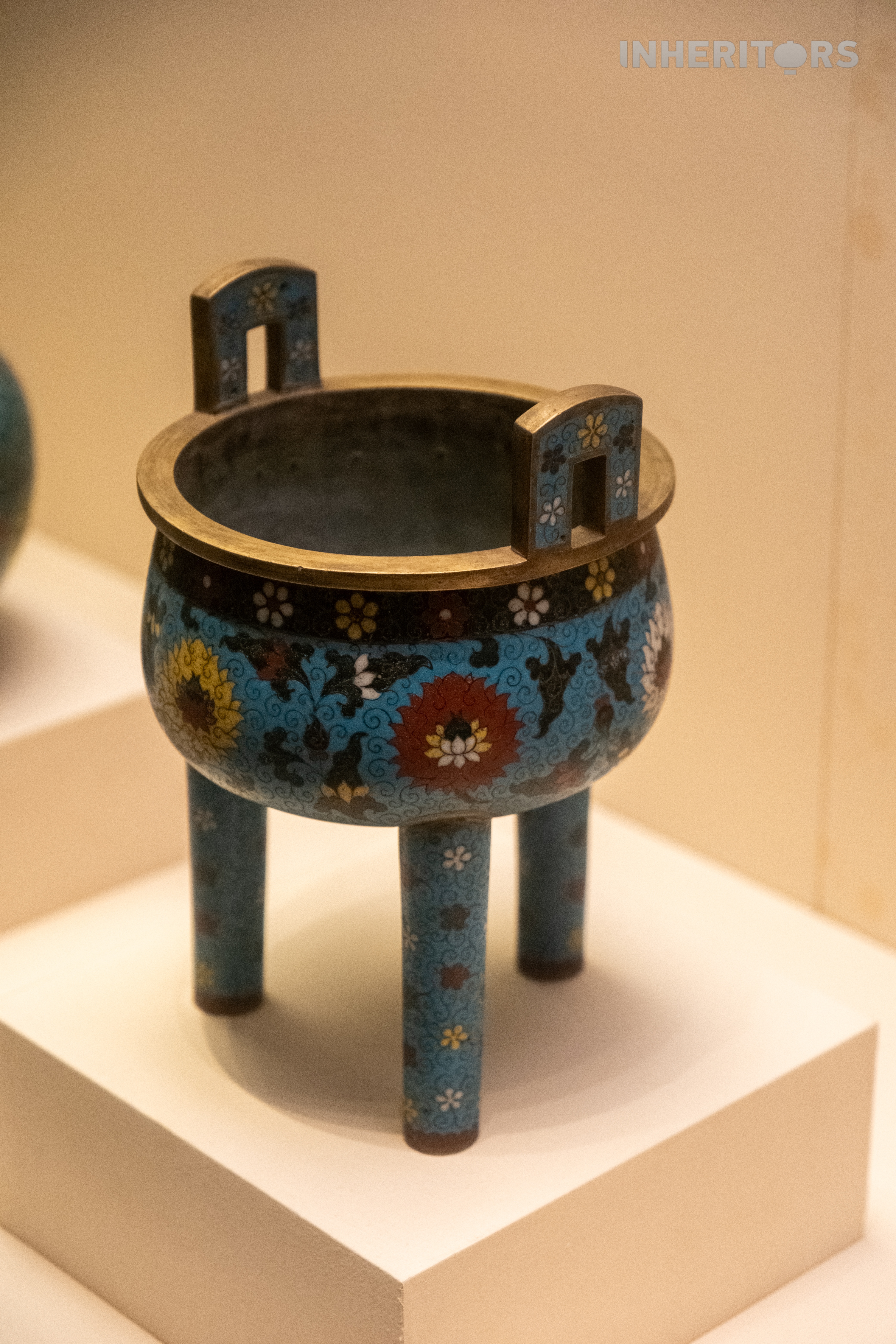 During summer, incense was more than fragrance — it was a way to stay refreshed. This cloisonné enamel ding is modeled after a bronze ritual vessel. The body is decorated with cloisonné enamel in hues of deep greens and blues, featuring lotus scrolls and chrysanthemum patterns. Inside, a bronze liner holds the incense, allowing it to diffuse gently through the air. A refined object of beauty and function, it reflects the height of cloisonné craftsmanship in the Ming Dynasty court.