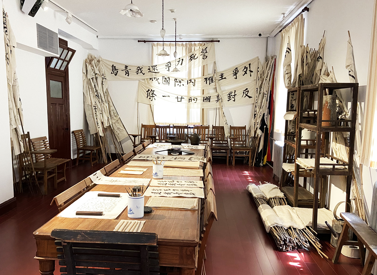 A replicated scene at the Red Building in Beijing shows the banners and slogans that the students of Peking University prepared for the parade during the May Fourth Movement. /CGTN