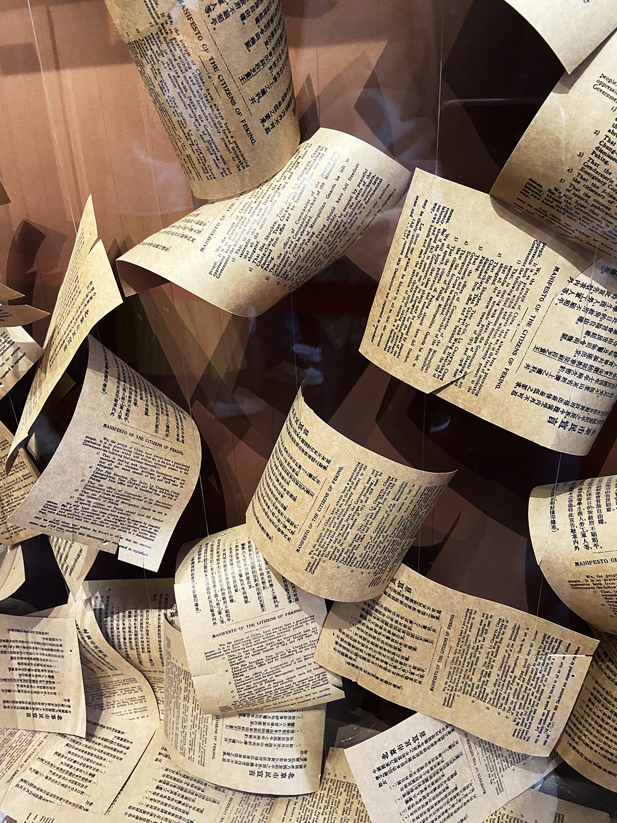 A replicated scene at the Red Building in Beijing shows copies of "Manifesto of the Citizens of Peking," a guiding declaration drafted by Chen Duxiu during the May Fourth Movement, fluttering down from above. /CGTN