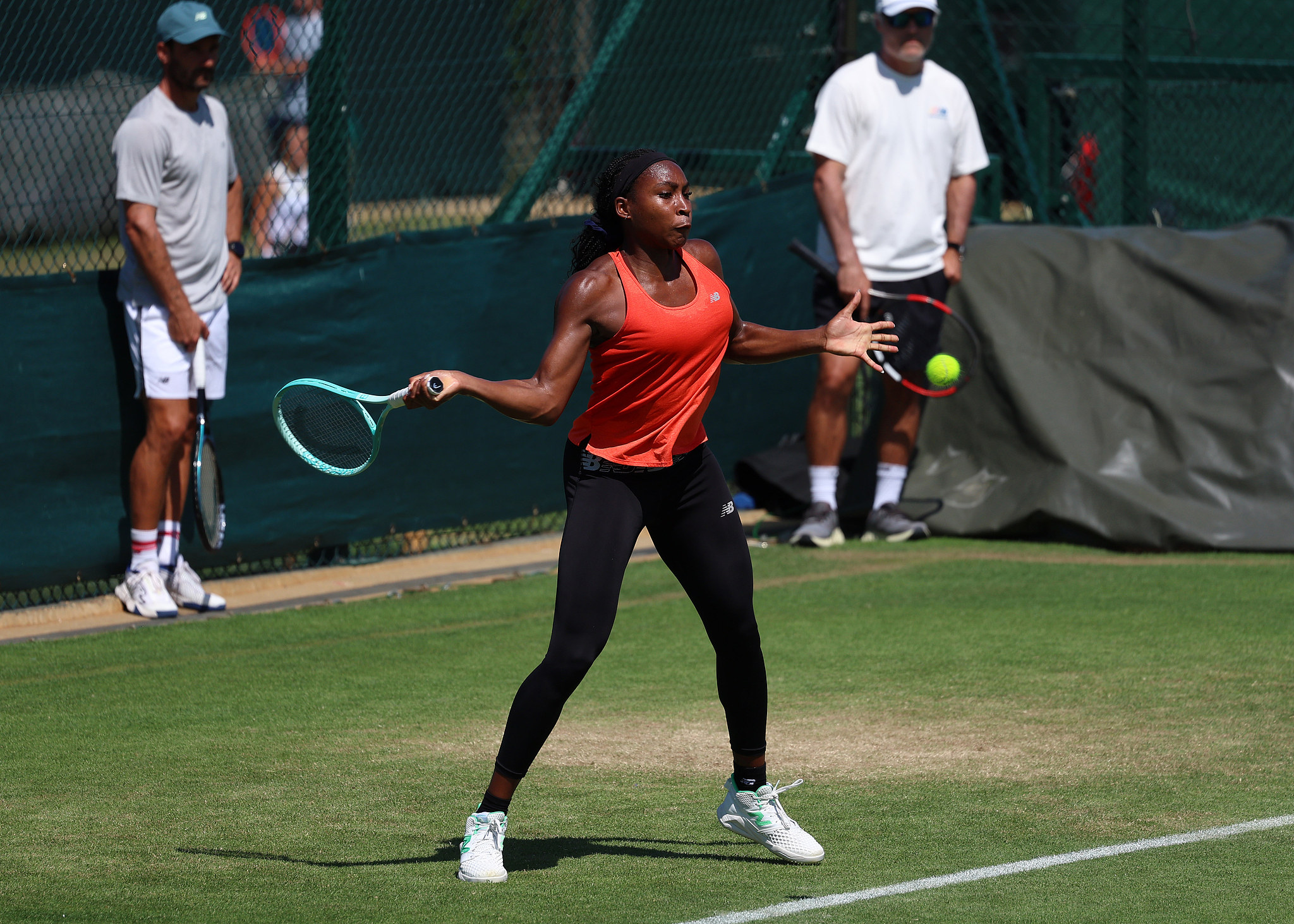 Coco Gauff of the USA hits a shot in practice ahead of the Wimbledon Championships at the All England Club in London, England, June 29, 2025. /VCG