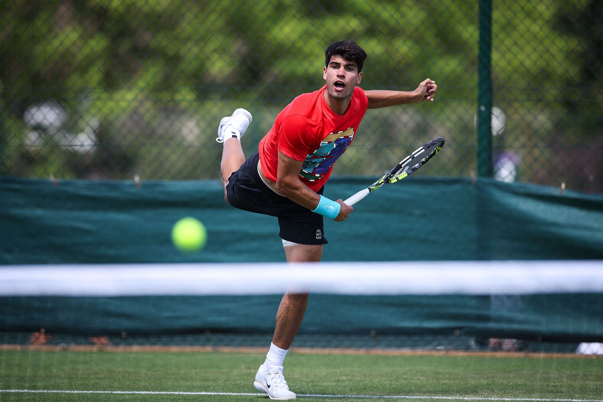 Carlos Alcaraz of Spain hits a shot in practice ahead of the Wimbledon Championships at the All England Club in London, England, June 29, 2025. /VCG