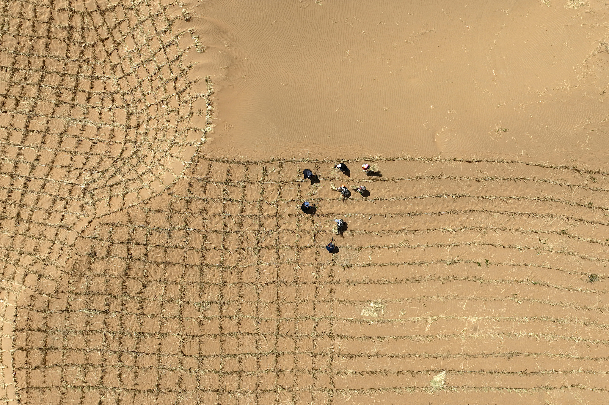 In Changliushui village, located in the city of Zhongwei, workers installed the final row of straw checkerboards, a traditional sand-fixing method, that locks the final stretch of shifting dunes in the Ningxia part of the Tengger Desert, following a sand control project spanning more than six decades.