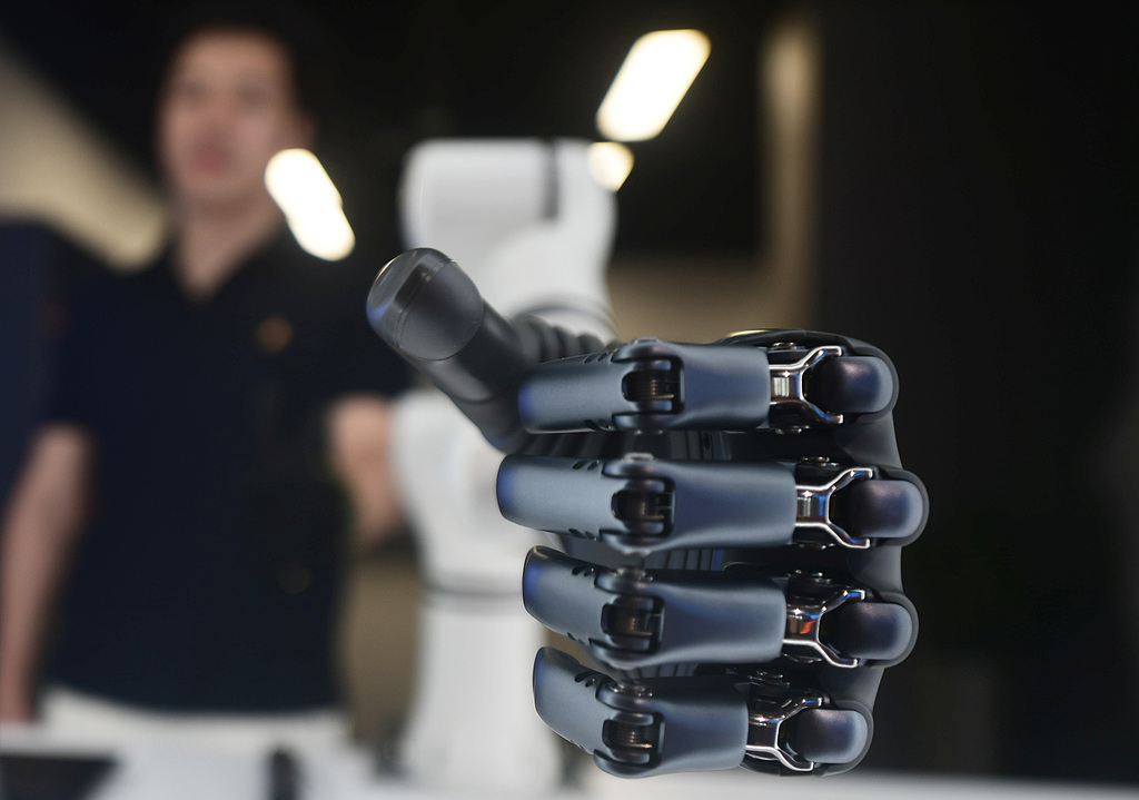 A staff showcasing an advanced AI bionic hand, China, May 4, 2025. /VCG