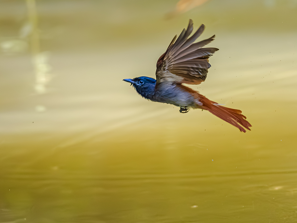 A red-bellied paradise flycatcher was recently spotted in Nanchang, Jiangxi Province, sweeping low across the water's surface, wings outstretched in a graceful arc as it snatched insects in midair. With its long tail streaming behind like silk, the bird's silhouette against the rippling water bore a striking resemblance to the legendary phoenix – an auspicious symbol in Chinese culture.
