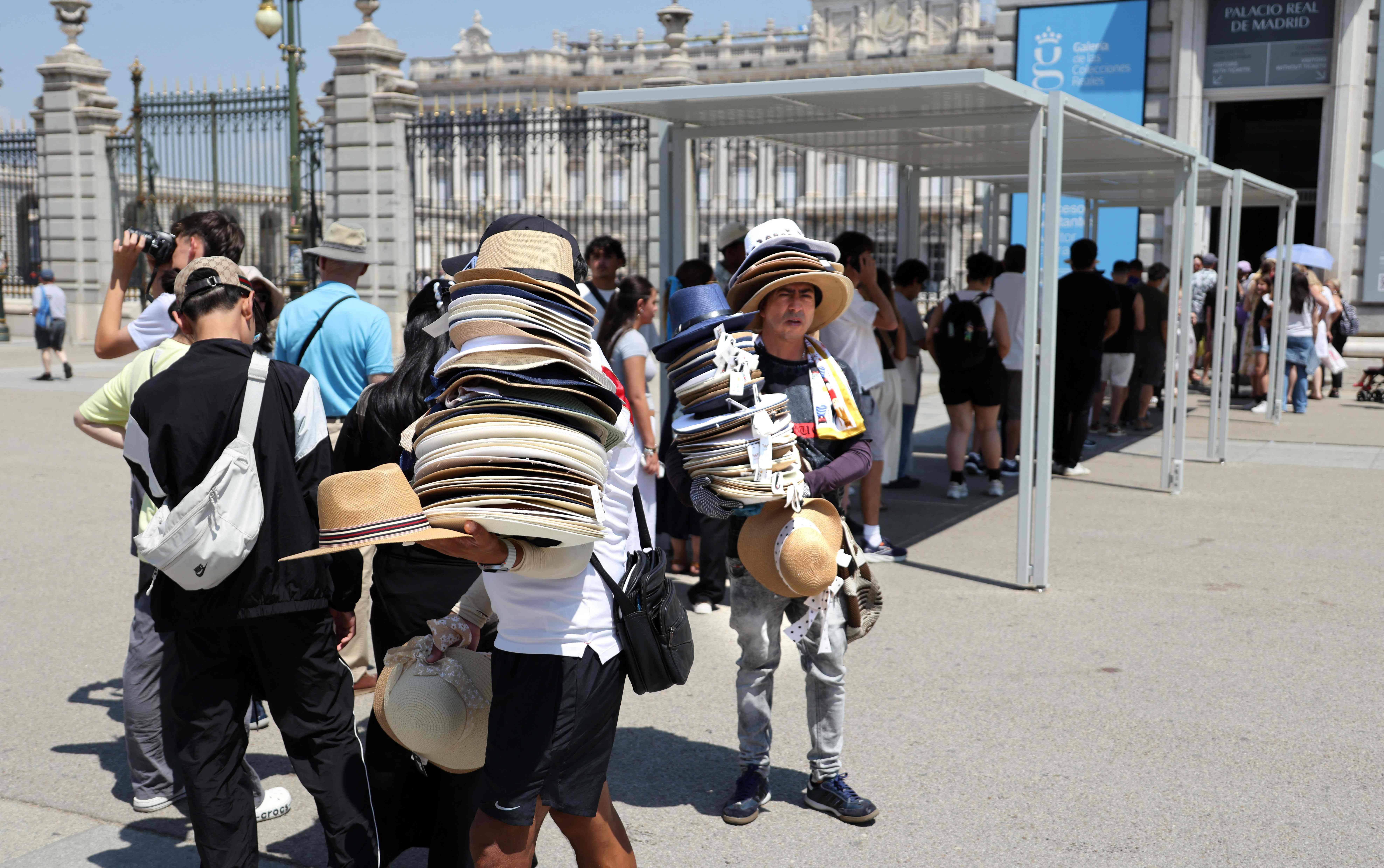Street vendors sell hats to tourists in front of the Royal Palace during a heat wave in Madrid, Spain, July 2, 2025. /AFP