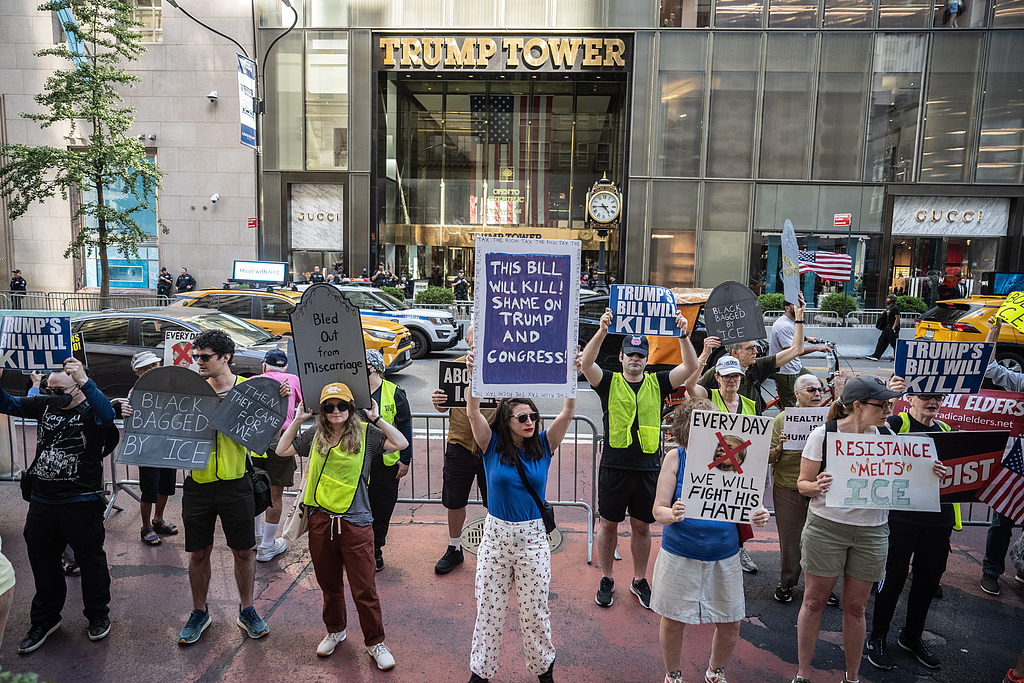 A coalition of activist groups participates in a demonstration against the "big and beautiful bill" in front of Trump Tower in New York City, U.S., July 4, 2025. /VCG