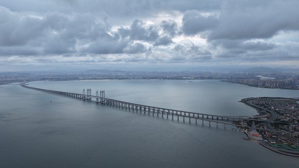 Dense clouds over the Quanzhou Bay ahead of Typhoon Danas making landfall in Quanzhou, Fujian Province, southeast China, July 5, 2025. /VCG