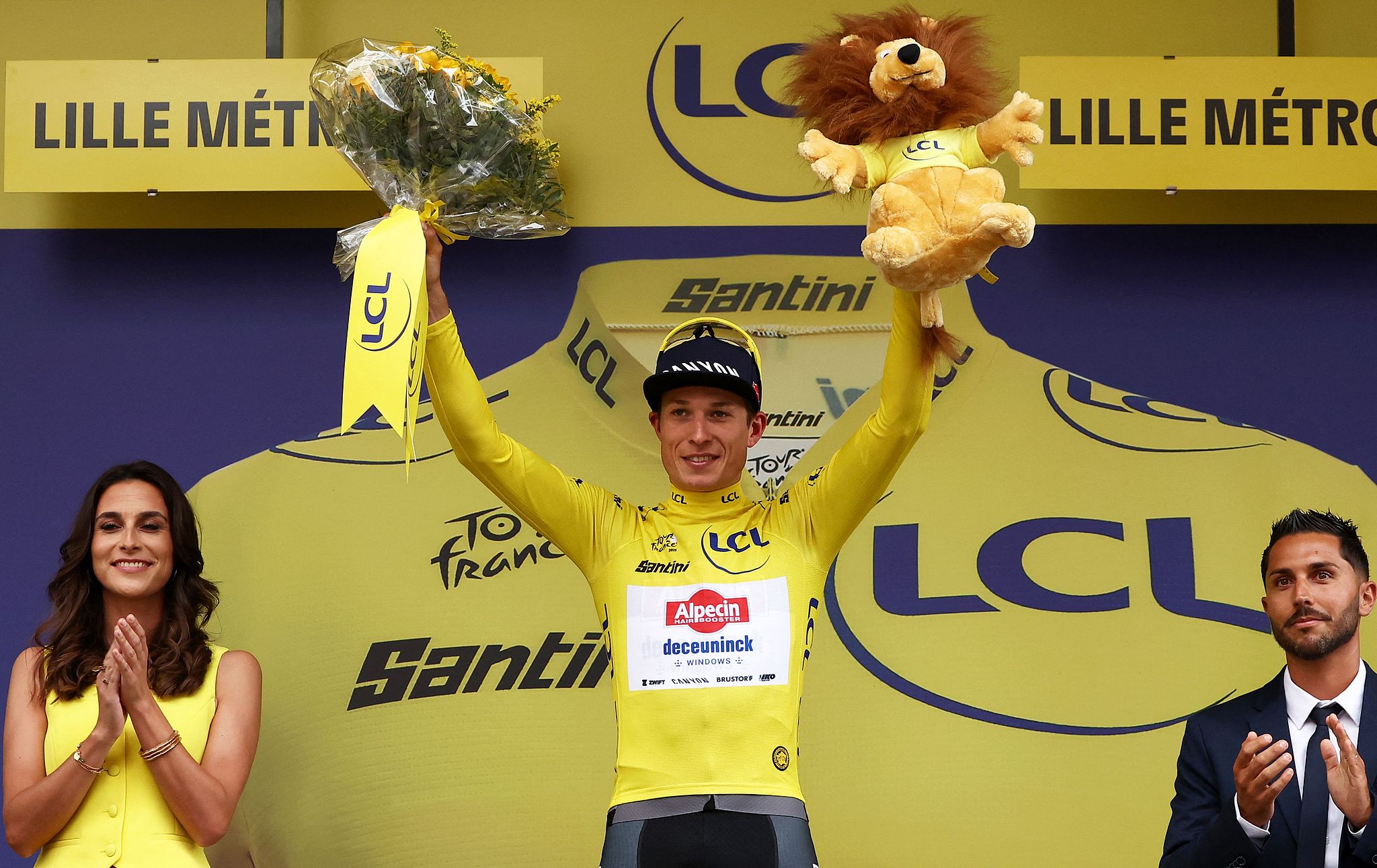 Jasper Philipsen (C) of Alpecin-Deceuninck wins the first stage of the Tour de France and wears the yellow jersey in Lille, France, July 5, 2025. /VCG