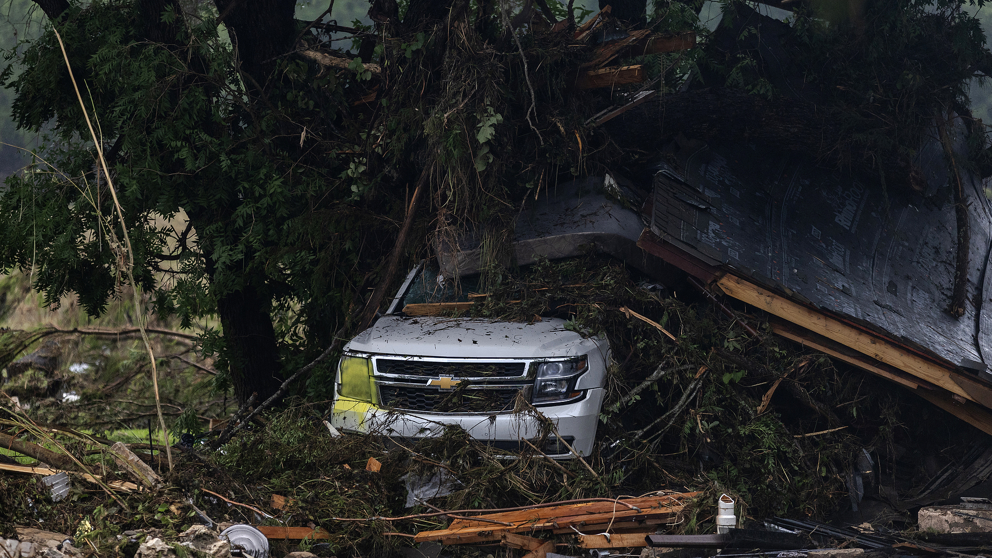 An SUV is covered in debris near Camp Mystic in Hunt, Texas, U.S., July 6, 2025. /VCG