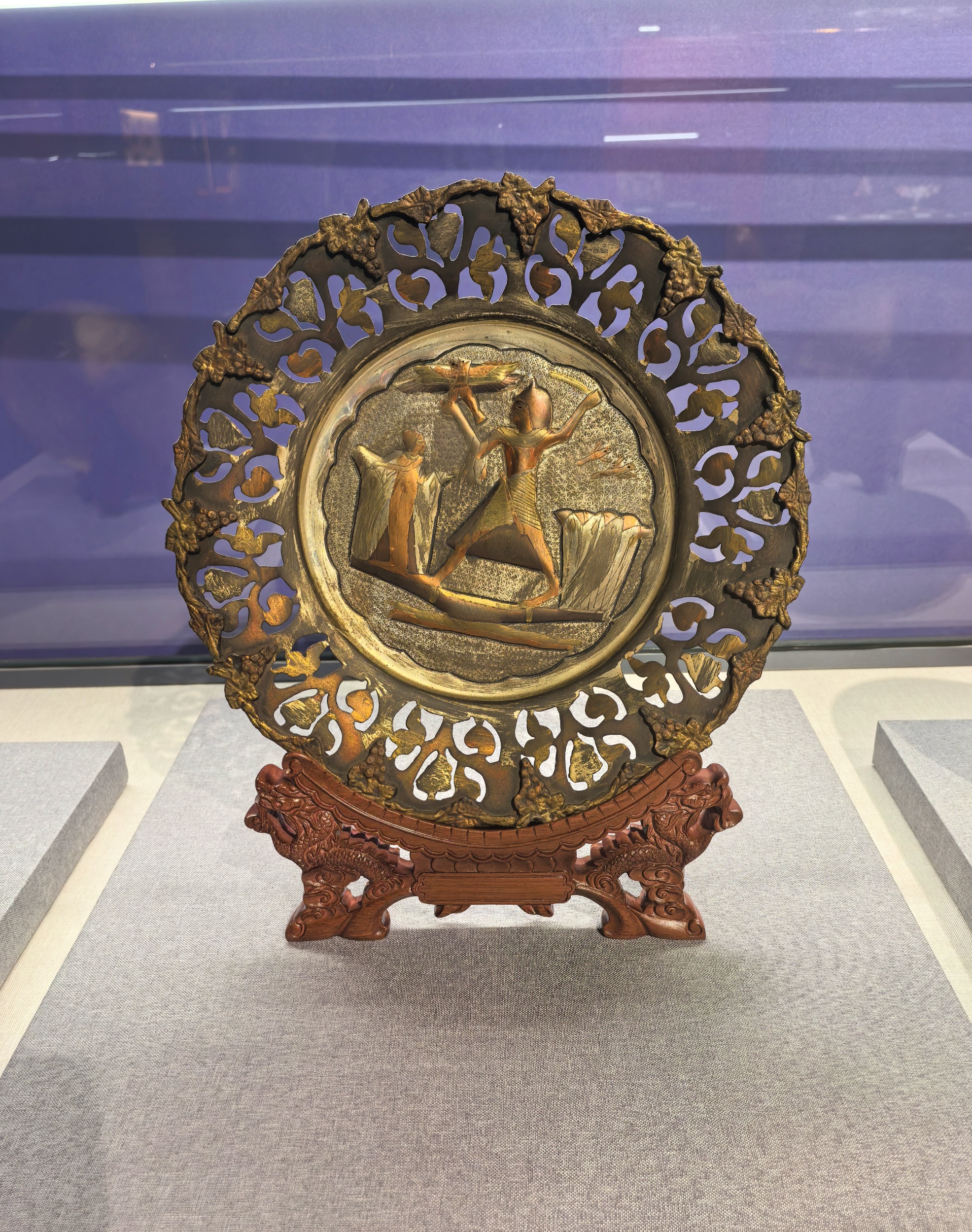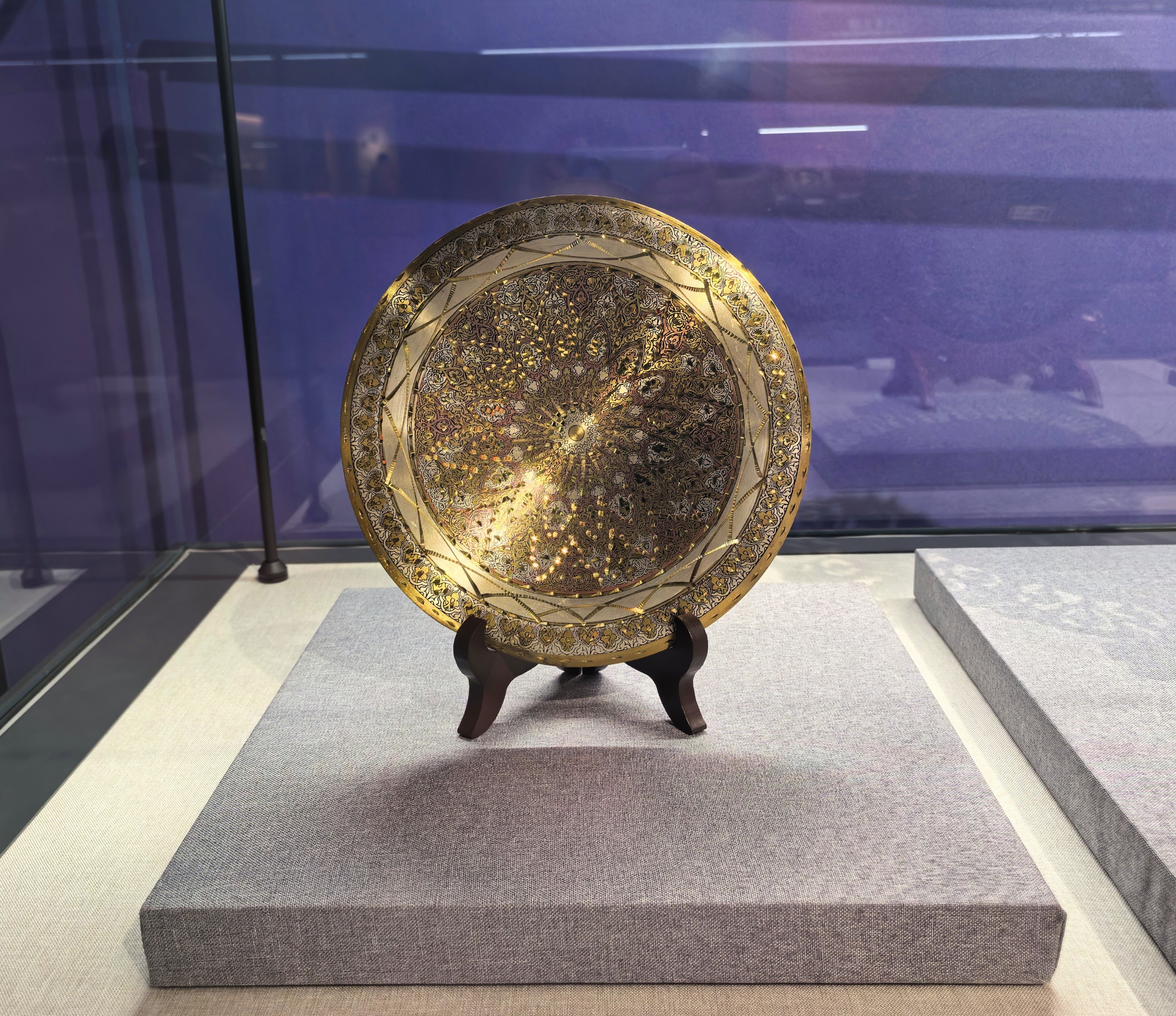 A hand-engraved feather-patterned copper plate from Egypt is displayed at the Silk Road International Arts Center in Langfang, north China's Hebei Province, on July 6, 2025. /CGTN