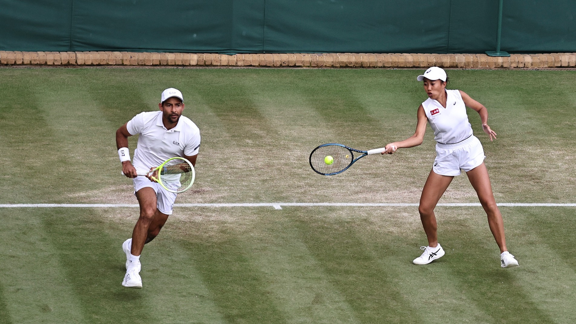 Zhang Shuai (R) returns a shot in the mixed doubles match with Marcelo Arevalo against Jiang Xinyu and Luke Bambridge at Wimbledon at the All England Lawn Tennis and Croquet Club in London, UK, July 6, 2025. /VCG