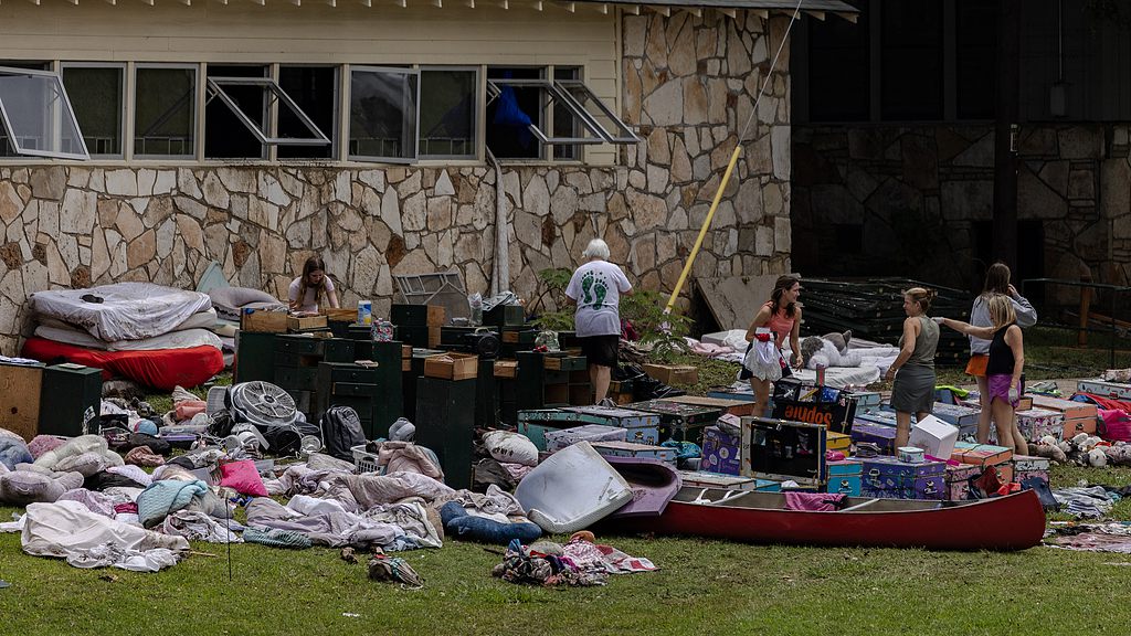 People look through items left behind in the bunks at Camp Mystic that were not swept away by the flash flooding, July 7, 2025, in Hunt, Texas. /VCG