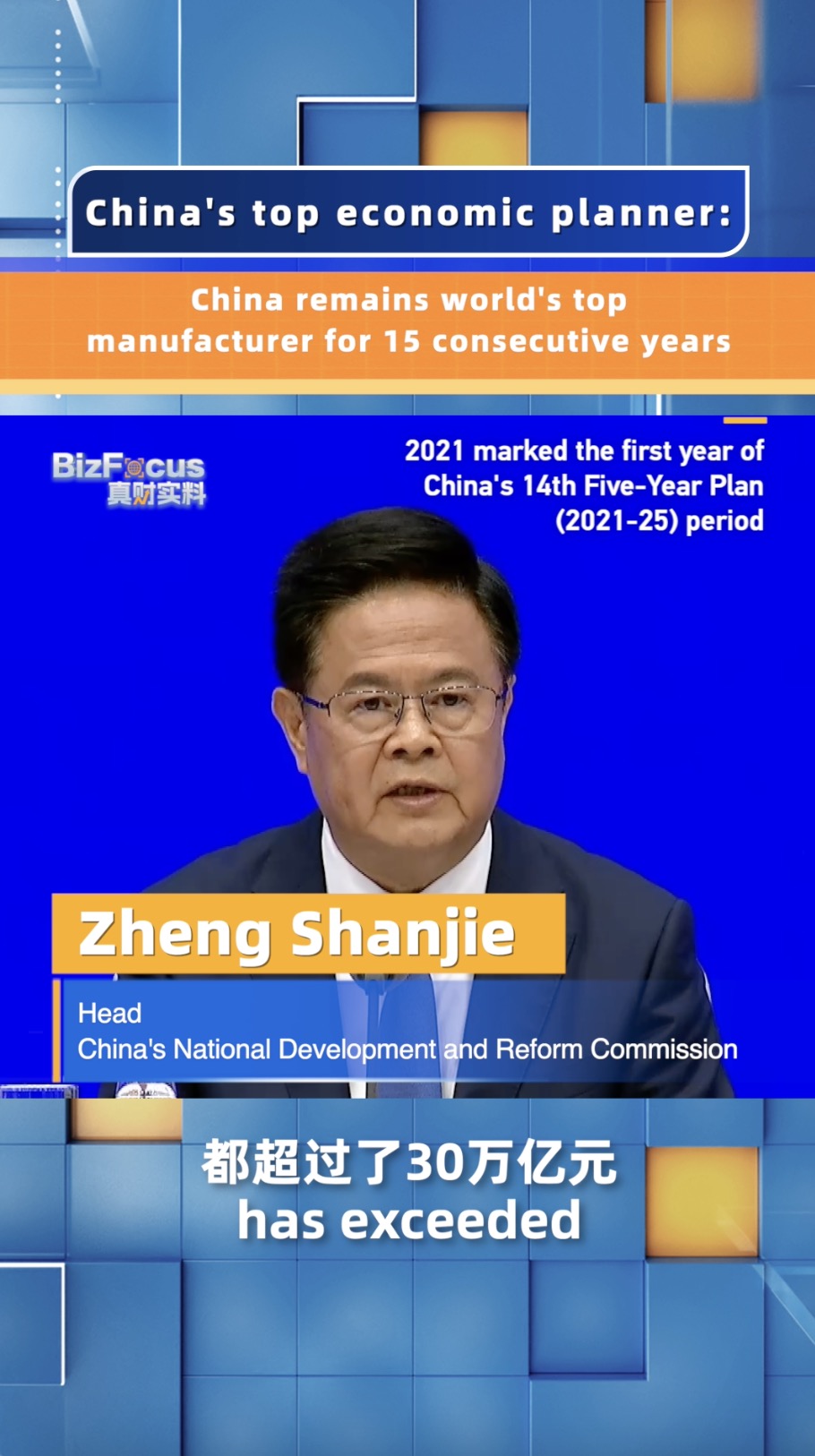 Since 2021, the first year of China's 14th Five-Year Plan period, the added value of China's manufacturing industry has exceeded 30 trillion yuan every year, and China has remained the world's largest manufacturing country for 15 consecutive years, Zheng Shanjie, head of the National Development and Reform Commission, said on Wednesday.
