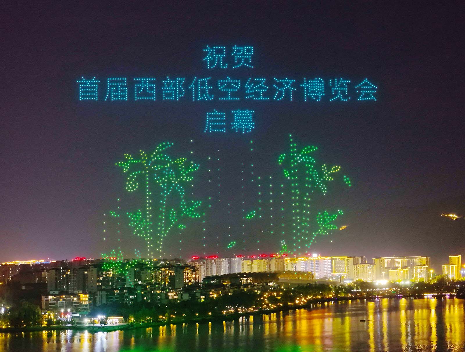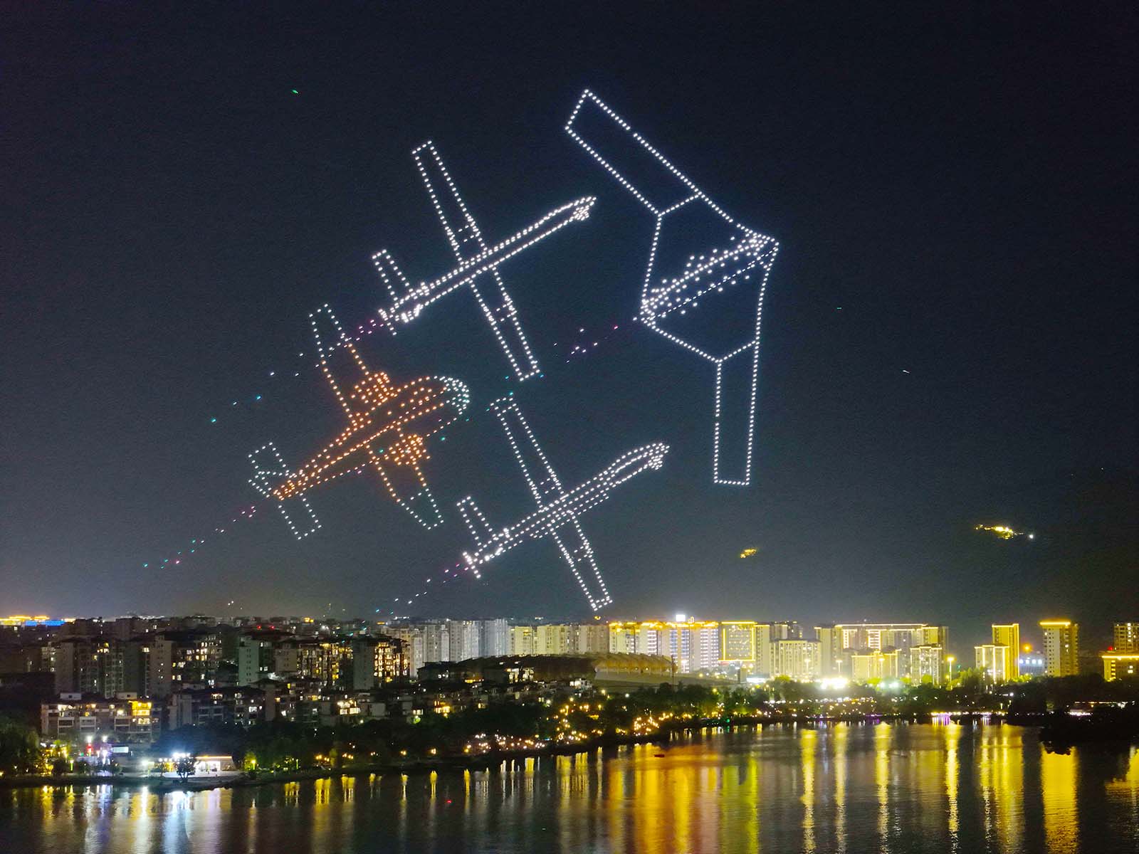 A light show is staged at Shuanggui Lake National Wetland Park in Chongqing on July 11, 2025 as part of the first Western China Low-Altitude Economy Expo. /IC