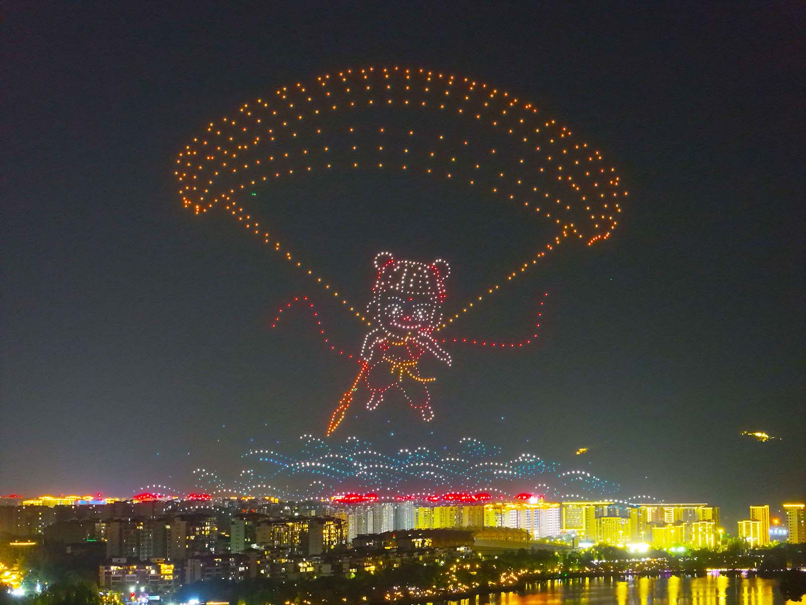 A drone display lights up the night sky above Shuanggui Lake National Wetland Park in Chongqing on July 11, 2025 as part of the first Western China Low-Altitude Economy Expo. /IC