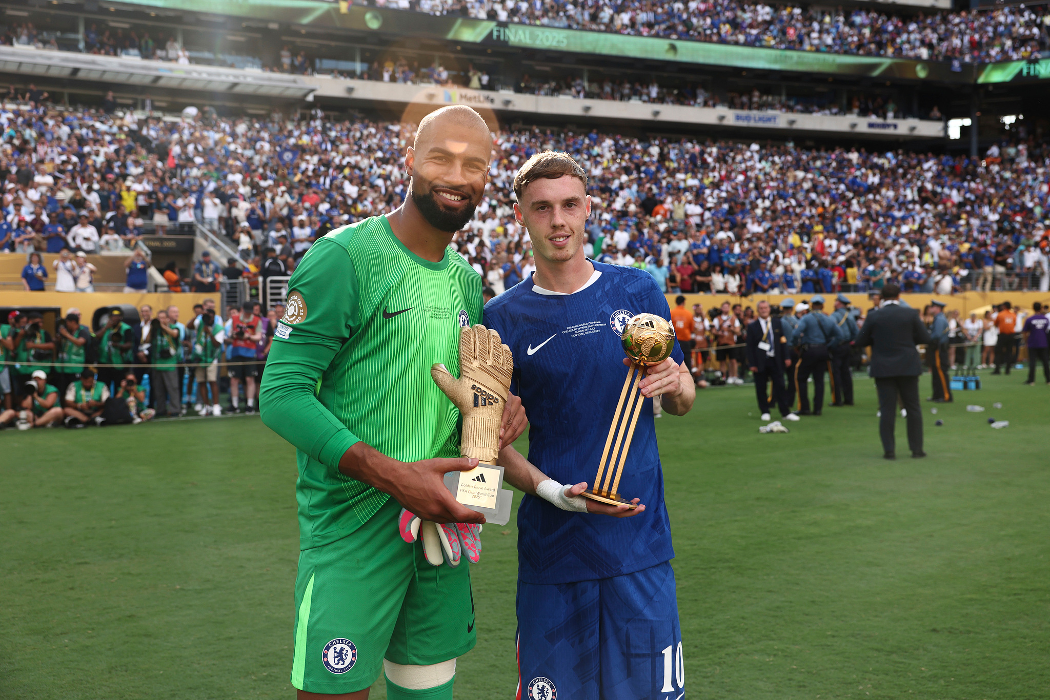 Chelsea's Robert Sanchez (L) holds the golden glove trophy as Cole Palmer holds the golden ball trophy after Chelsea beat Paris St Germain in the Club World Cup final at MetLife Stadium, New Jersey, U.S., July 13, 2025. /VCG