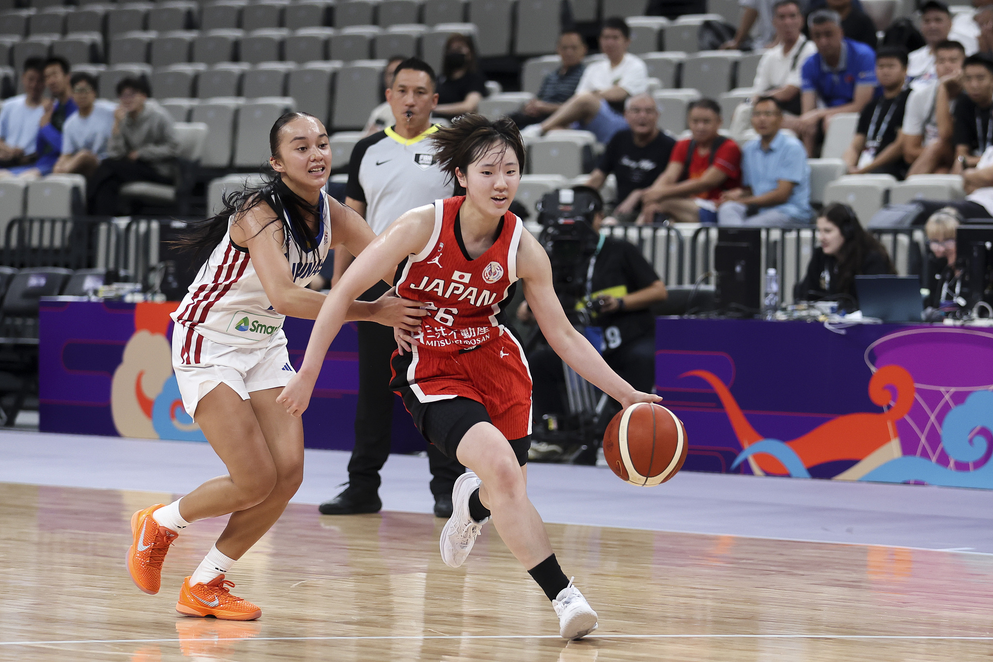 Kokoro Tanaka (R) of Japan dribbles in the group game against the Philippines at the FIBA Women's Asia Cup in Shenzhen, south China's Guangdong Province, July 14, 2025. /VCG