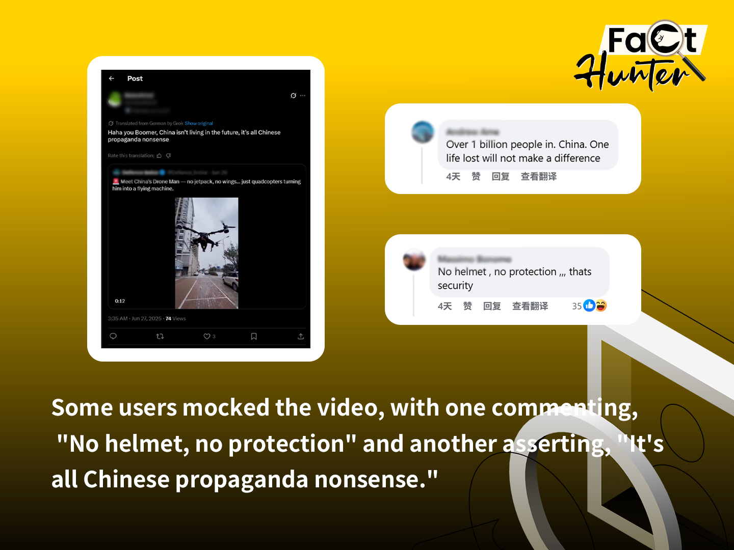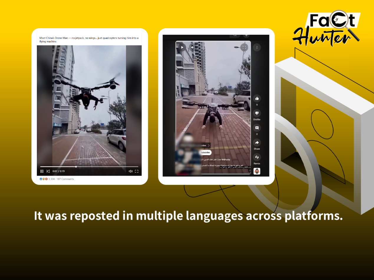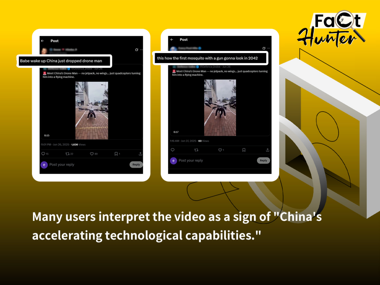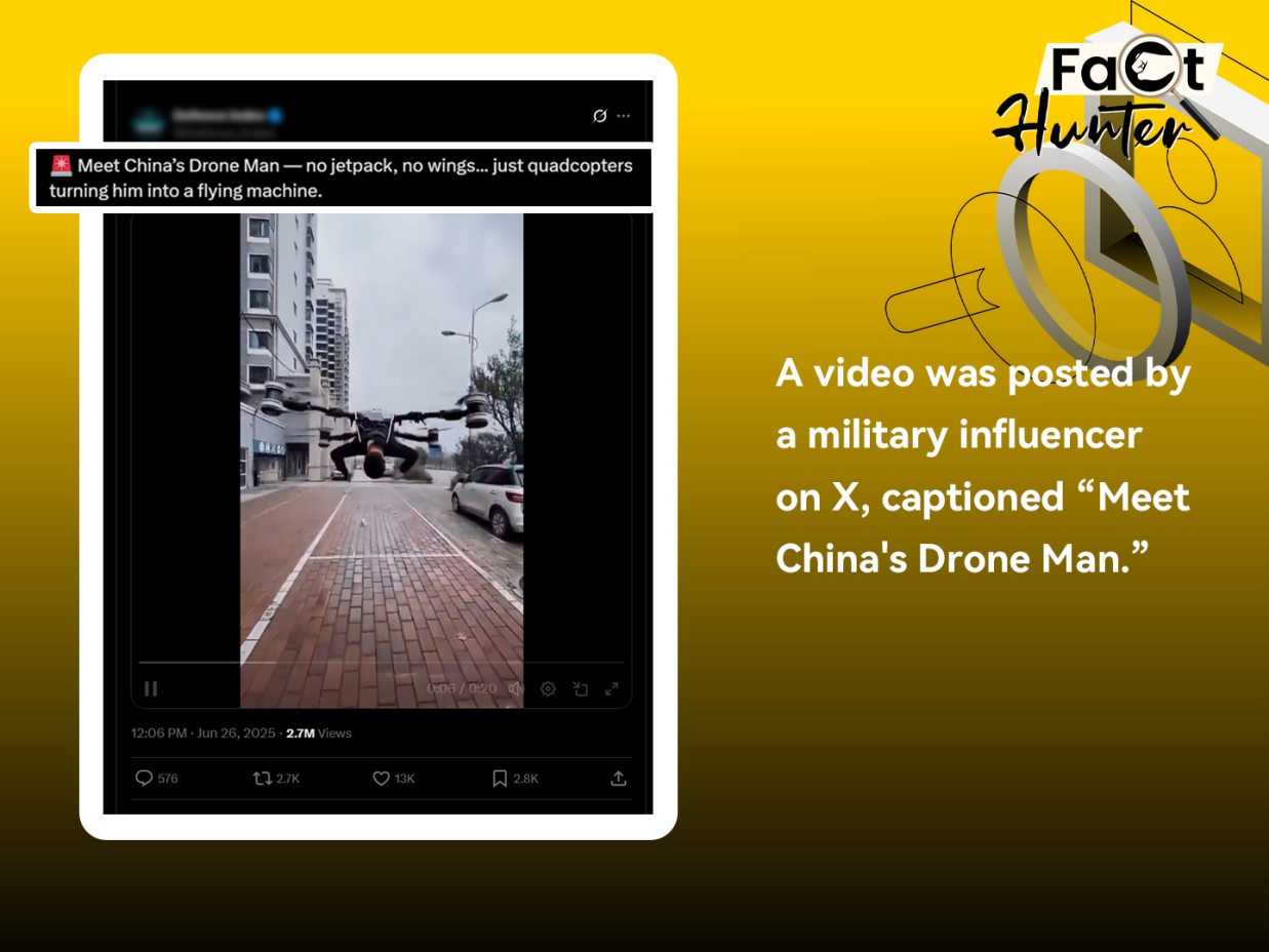 On June 26, 2025, a video was posted by a military influencer on X, captioned "Meet China's Drone Man." This video shows a Chinese man flying with a drone. However, while the man and device are real, the takeoff was digitally fabricated. It was subsequently reposted in multiple languages, spreading across platforms like YouTube and LinkedIn.