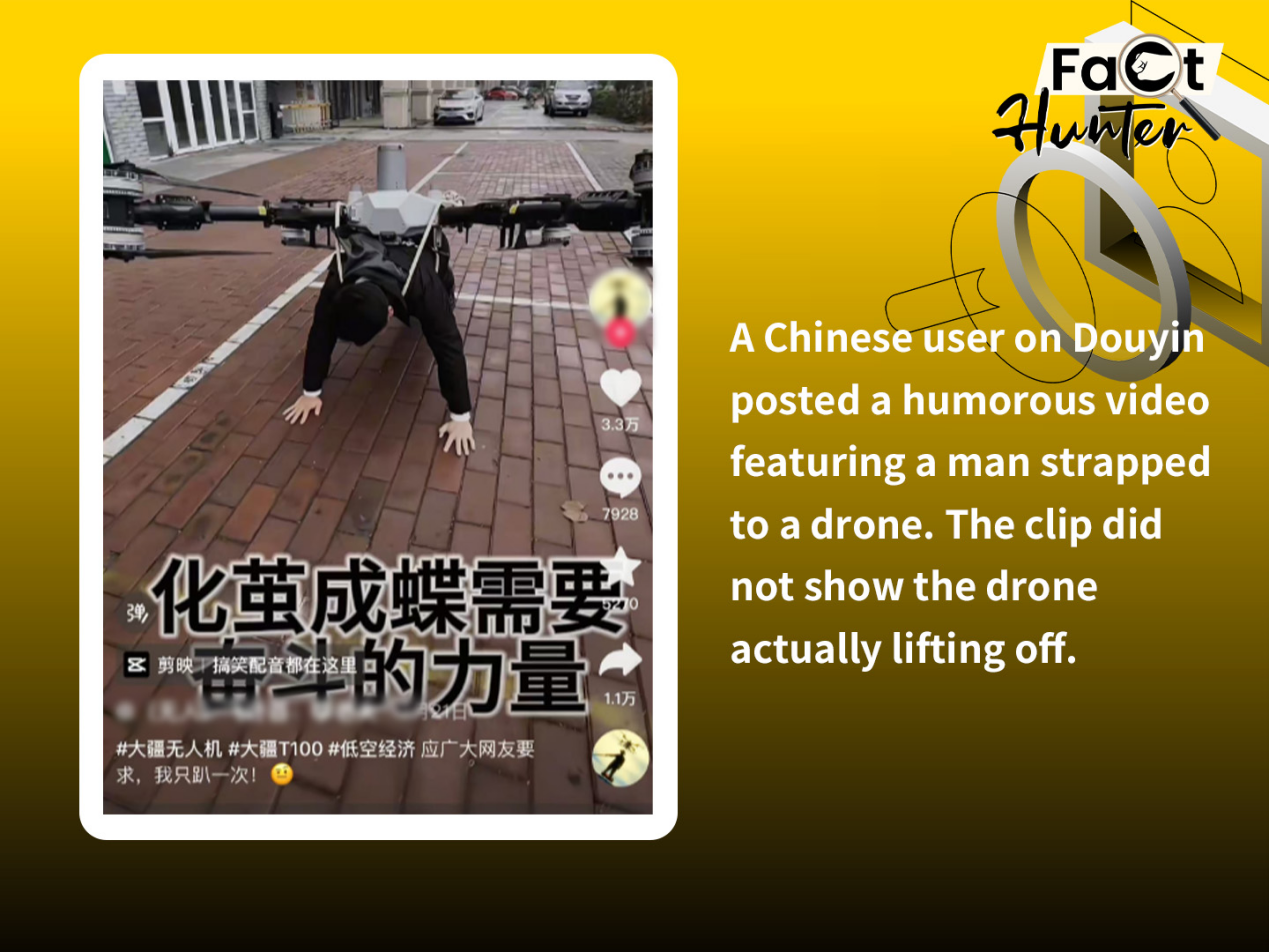 On February 21, 2025, a Chinese user on Douyin posted a humorous video featuring a man strapped to a DJI T100 drone. The clip, clearly staged for entertainment, did not show the drone actually lifting off.