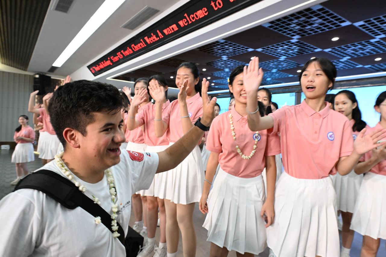 The American One Voice Children's Choir wave goodbye to students from Fuzhou No.16 High School after singing "You'll Be in My Heart" on July 11, 2025. /Photo provided to CGTN