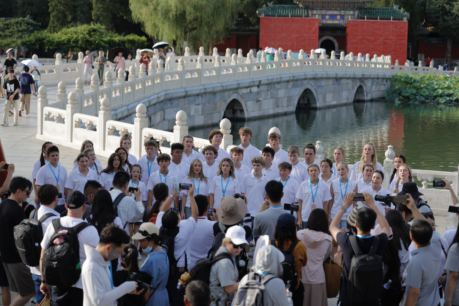 The One Voice Children's Choir sings at Beijing's Beihai Park with onlookers and journalists using phones and cameras to capture the moment on July 13, 2025. /Photo provided to CGTN