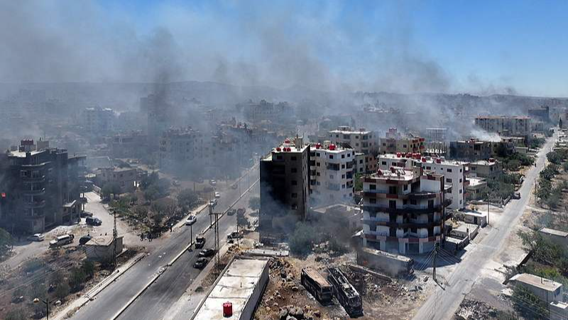An aerial view shows smoke rising in the city of Sweida in southern Syria's Druze majority province, July 19, 2025. /VCG