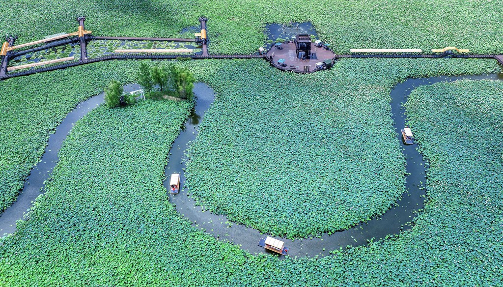 Immerse yourself in a cloud of lotus plants in the ponds of Taizhou, Jiangsu Province. Rafts crisscross between stretches of lotuses, offering visitors a charming summer outing in east China.