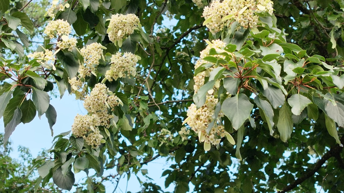 The tree is covered with numerous flowers, and its crown is blanketed in white and yellow funnel-shaped blossoms. Persistently enlarged, leaf-like calyx lobes interspersed among the flowers present gradients of color, ranging from white and pale yellow to light red. When a gentle breeze blows, the fragrance of the flowers fills the air, creating a vivid, natural scene.
